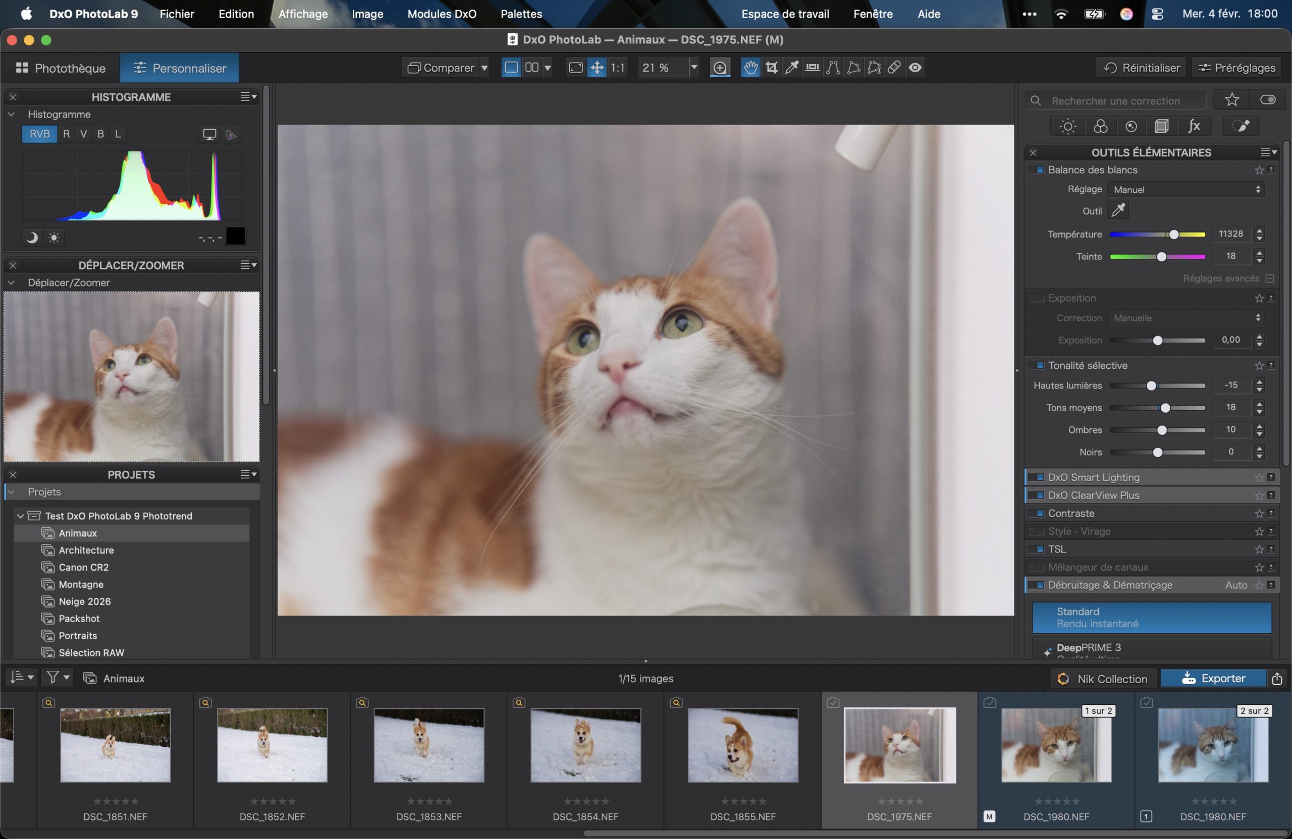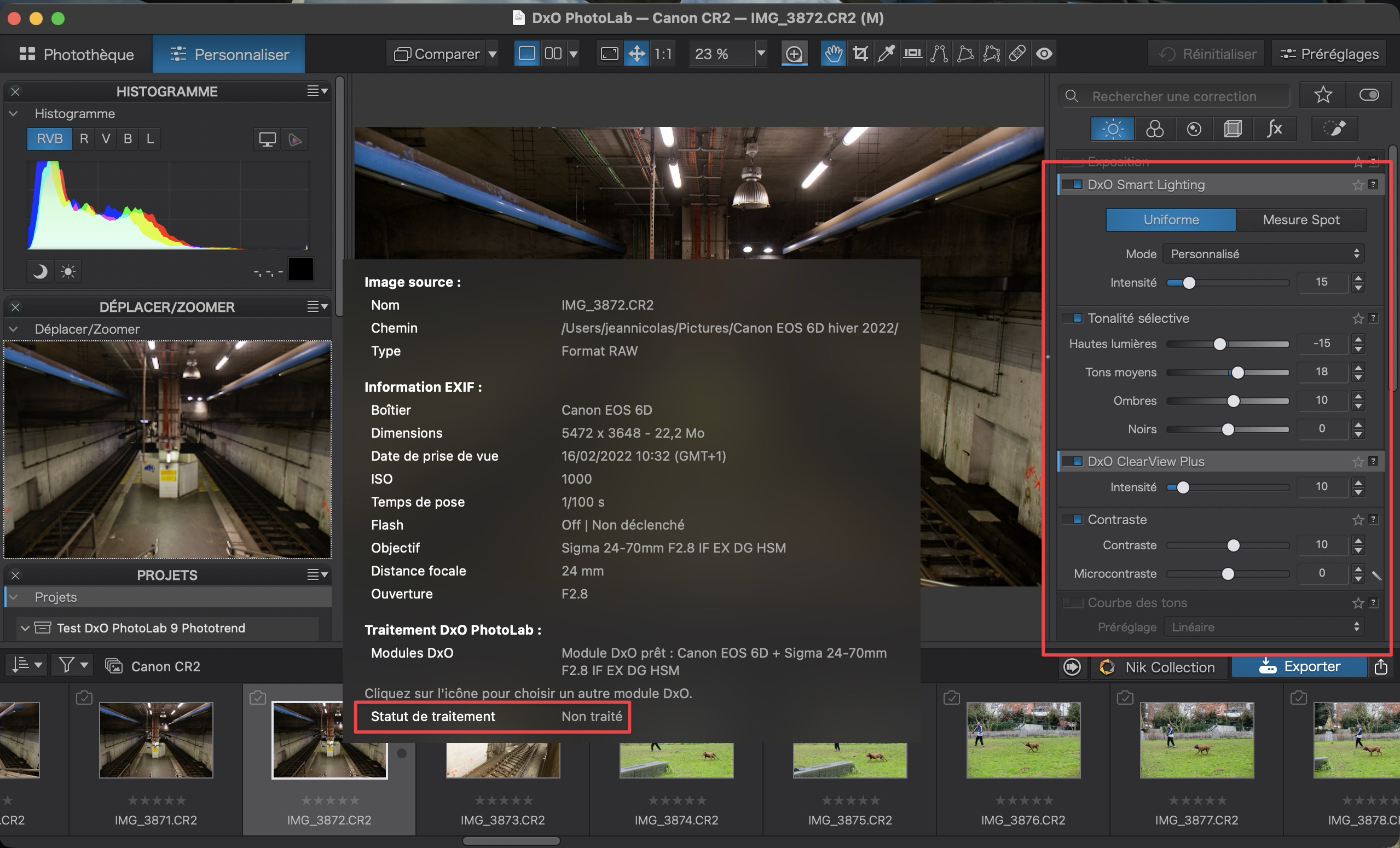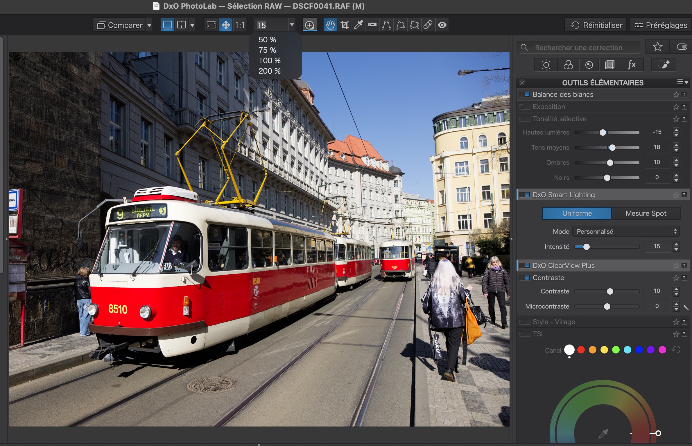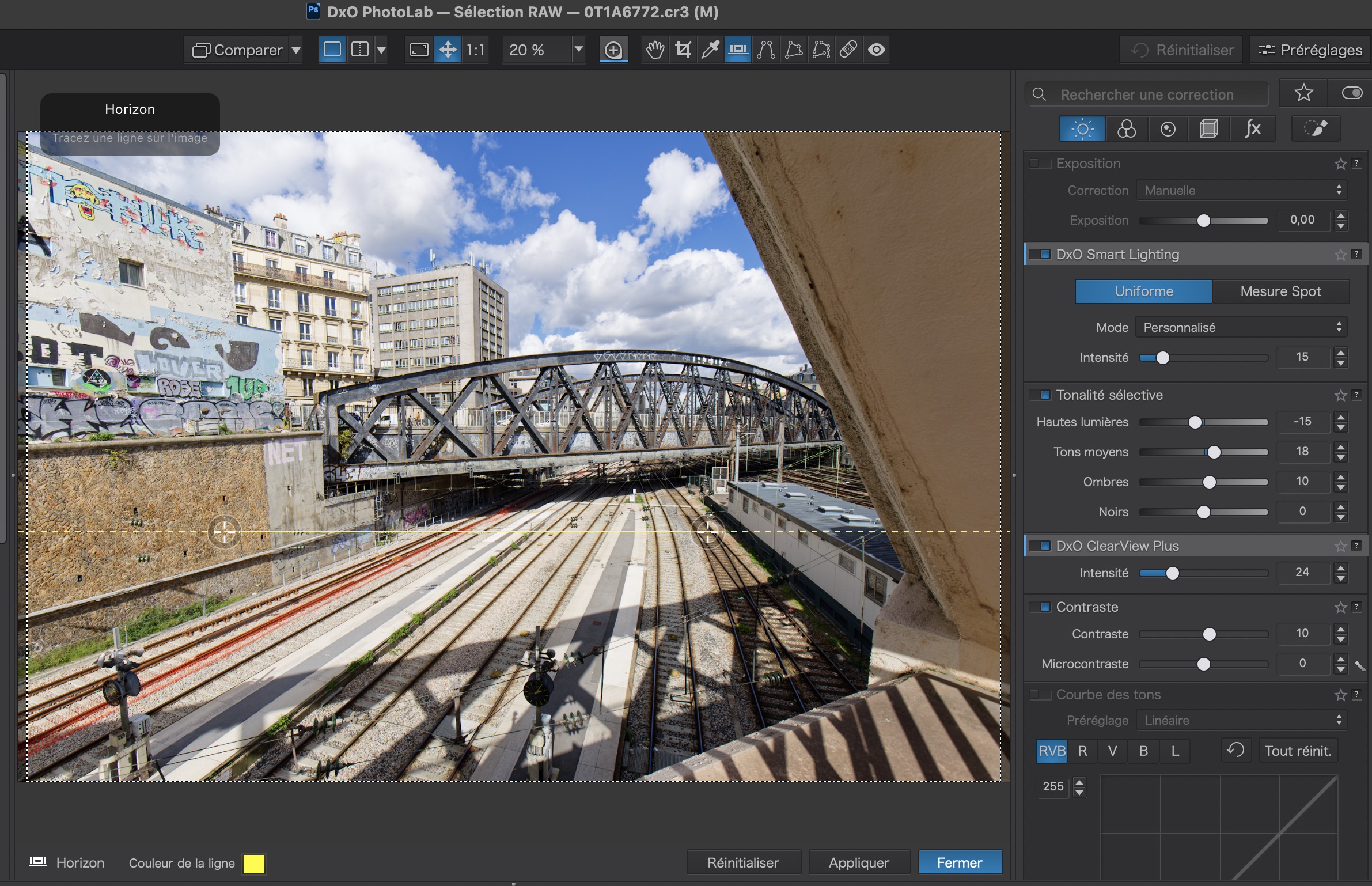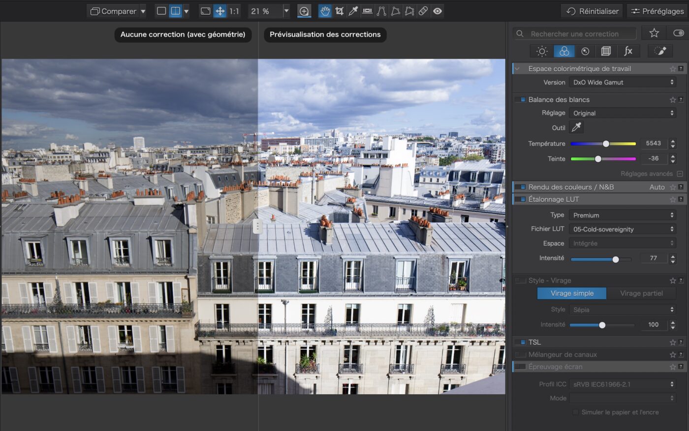 Dès l’ouverture d’un fichier, PhotoLab applique des corrections automatiques incluant DxO Smart Lighting, ClearView Plus, Débruitage et Dématriçage, les outils de Tonalité sélective ainsi qu’une légère accentuation des contrastes. C’est un point important à prendre en compte, car même si vous shootez en RAW, en ouvrant DxO PhotoLab, de nombreuses corrections sont déjà appliquées par défaut.