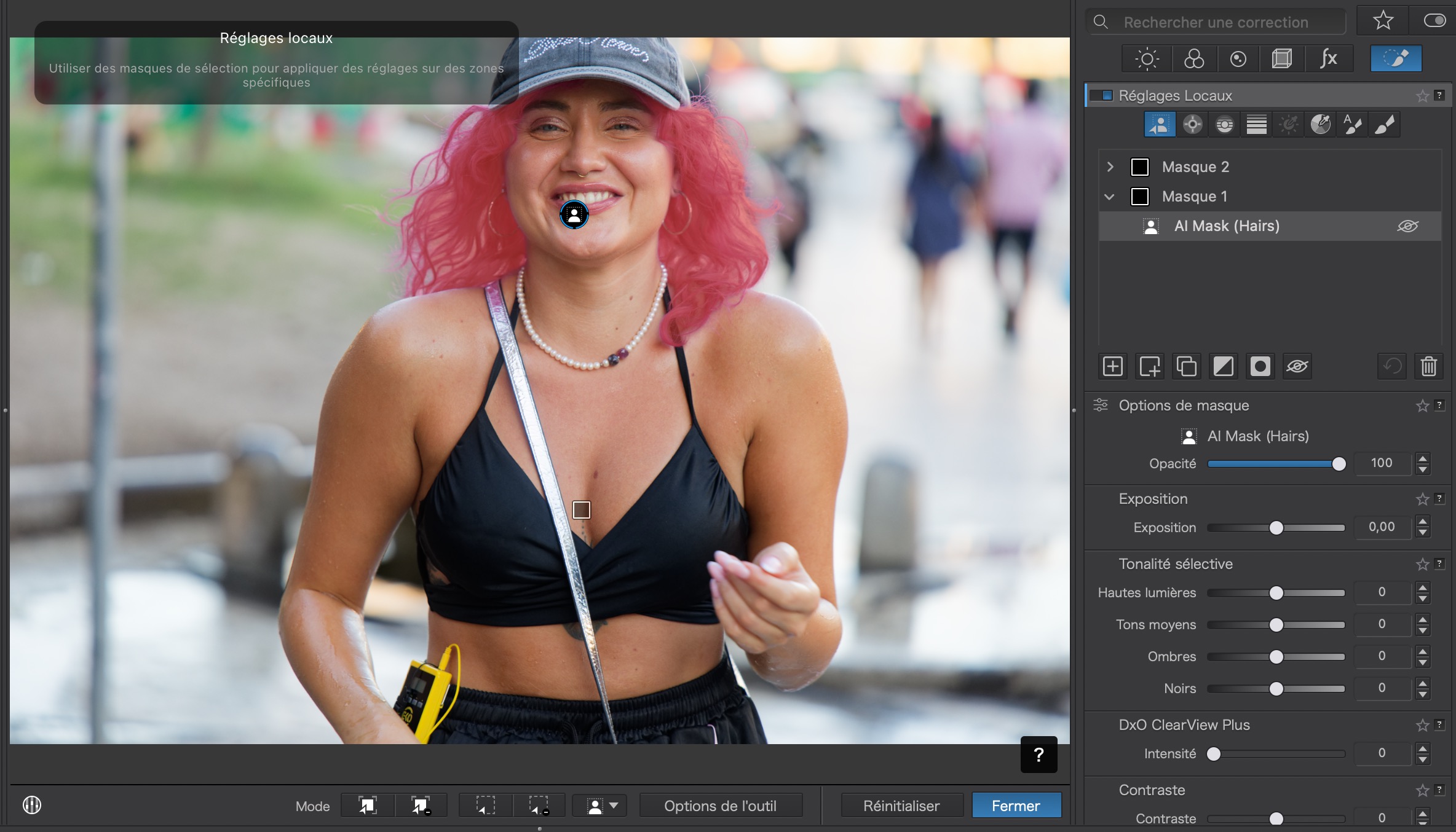 Ne cachons pas notre plaisir : dans l’ensemble, les masques IA de DxO PhotoLab 9 sont très convaincants. En photographie de portrait, la détection des cheveux se révèle extrêmement précise, y compris sur les mèches rebelles. Les modes dédiés aux vêtements, aux végétaux ou aux véhicules remplissent eux aussi parfaitement leur rôle.