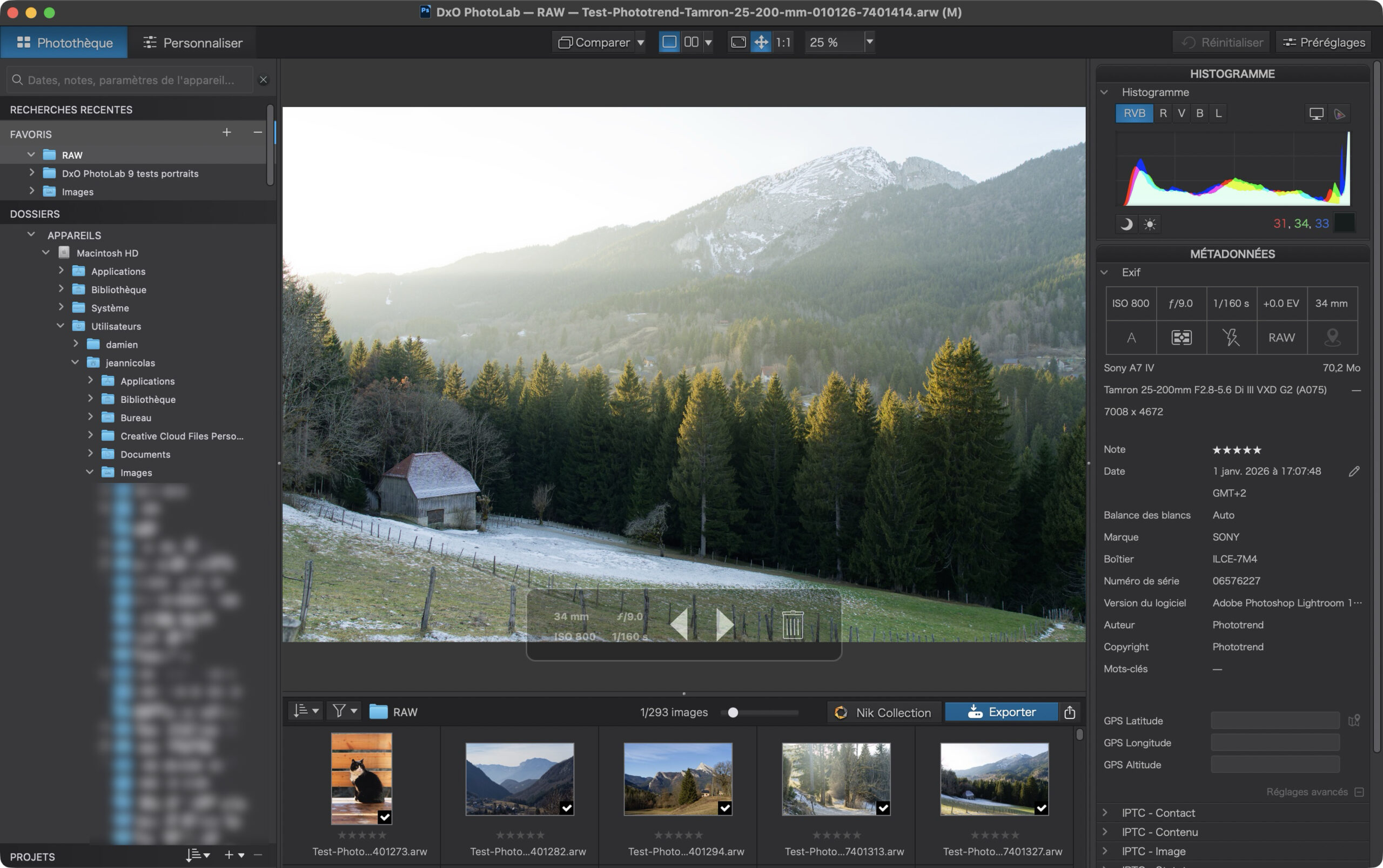 Et quelles performances à l’exportation des fichiers pour DxO PhotoLab 9 ? Pour mesurer cela, nous avons exporté 100 fichiers RAW issus d’un Sony A7 IV au format JPEG en qualité “Standard” (fichiers pleine taille, qualité 90 avec toutes les métadonnées). L’opération a pris 5 minutes et 46 secondes avec un MacBook Pro à puce M1 Pro, et 3 minutes et 15 secondes avec un Mac Mini à puce M4 Pro.