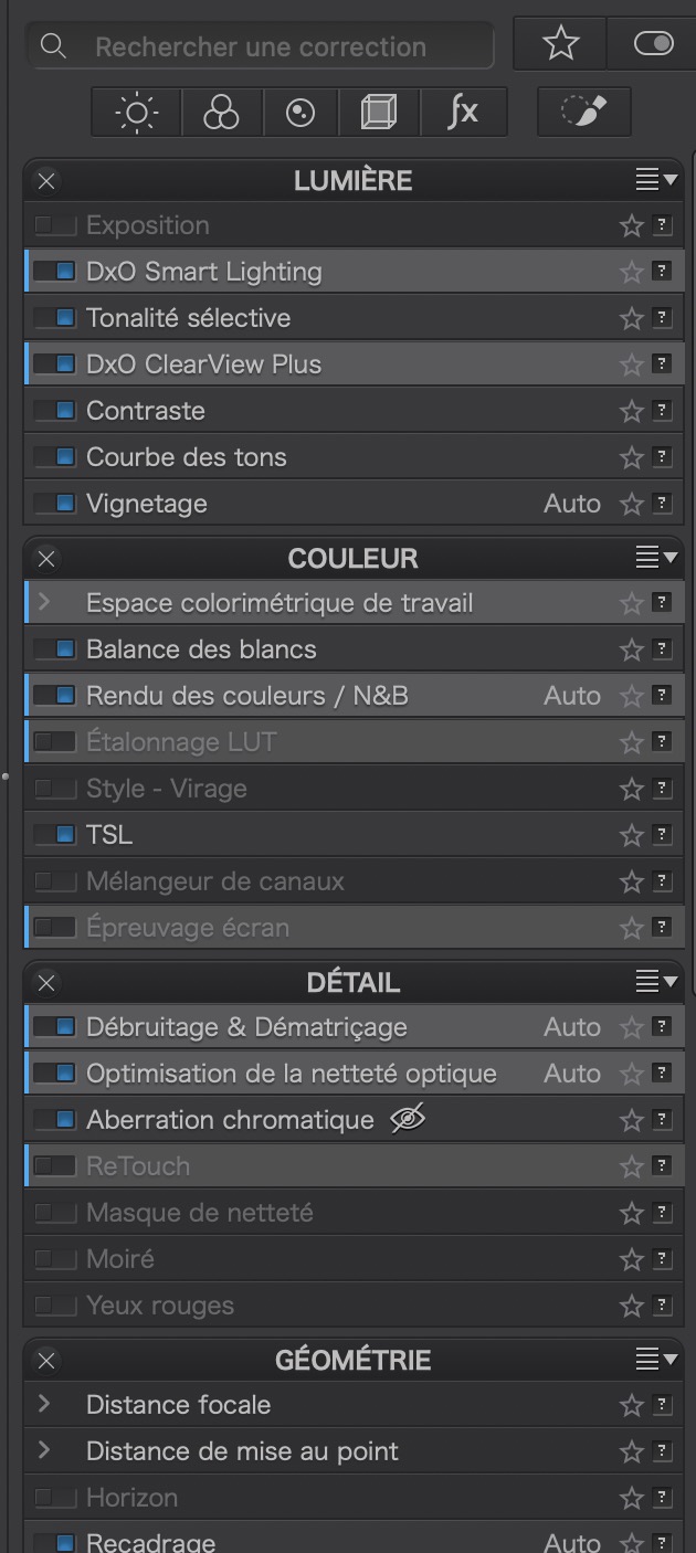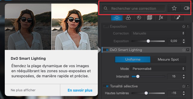 Pour gagner en efficacité, DxO propose une barre de recherche très pratique pour isoler un réglage précis, ainsi qu’un système de favoris permettant de composer sa propre palette d’outils prioritaires. De petites infobulles expliquent le rôle de chaque outil. Un petit commutateur permet de voir en un clic les outils de retouche utilisés sur l’image, et de les désactiver rapidement.