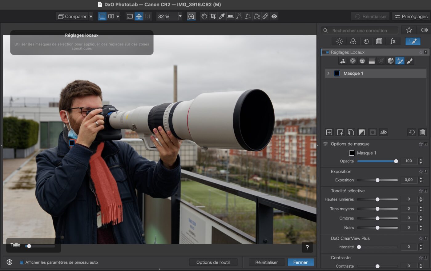 La force de DxO PhotoLab vient aussi de ses outils de retouche localisée. Ces derniers sont accessibles via le menu “Réglages Locaux” (via une petite icône pas très explicite en forme de pinceau).