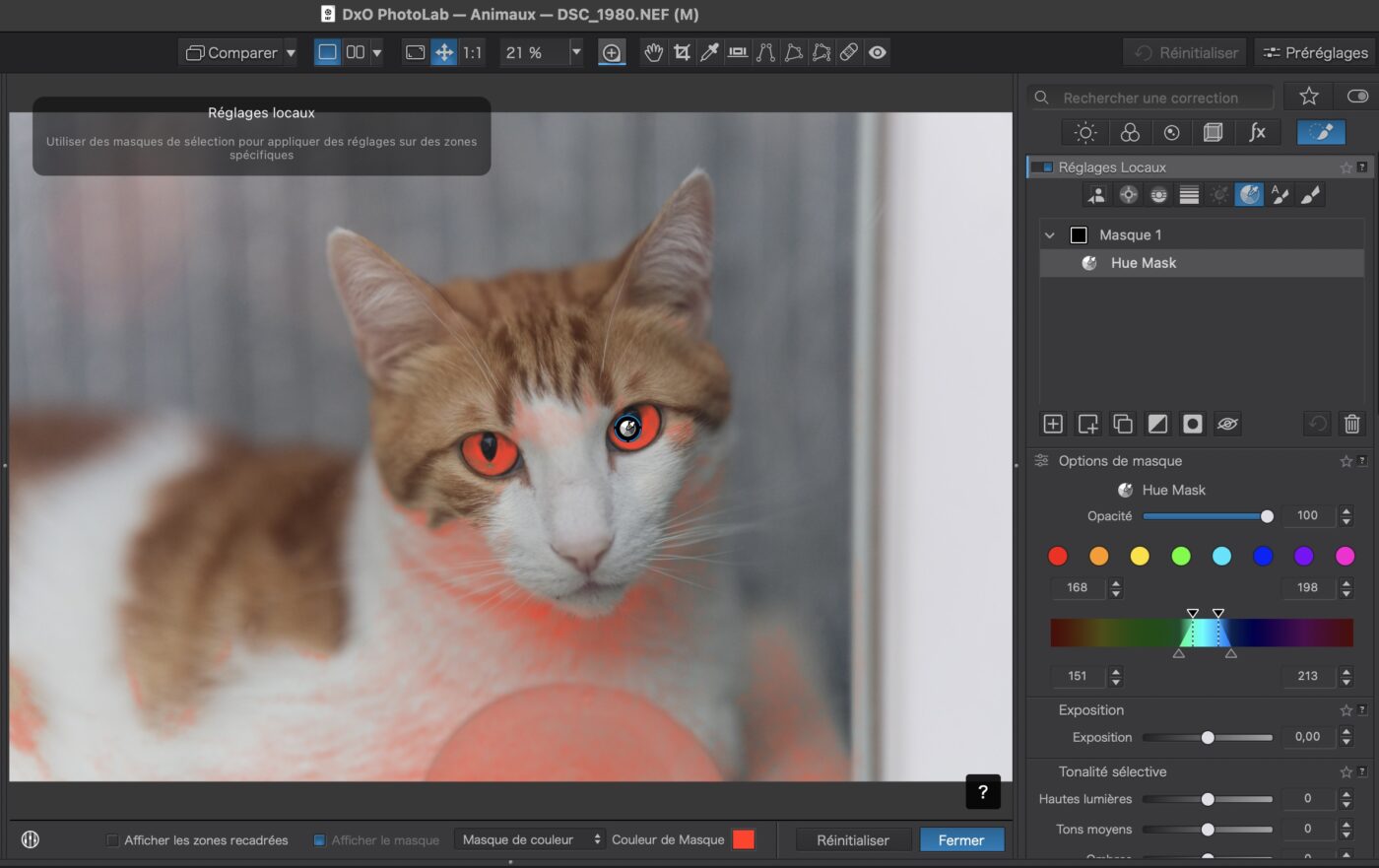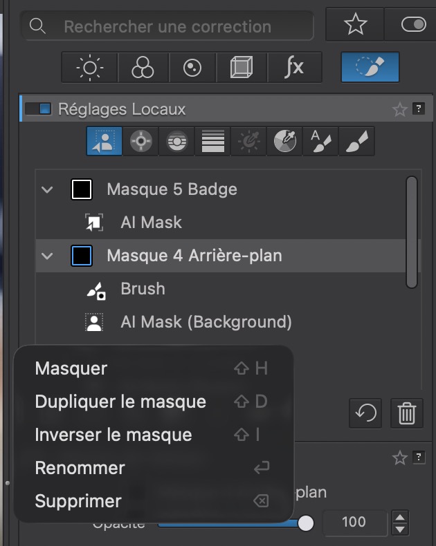 Les masques sont organisés de manière très logique dans le panneau des Réglages Locaux, dans la barre latérale de droite. Il est facile de les renommer, de changer leur ordre, de les dupliquer ou inverser, etc. En appliquant un masque, les outils de retouche associés au masque s’affichent dans la fenêtre juste en dessous, évitant des allers-retours fastidieux. Dommage que la hauteur de l’espace dédié aux masques soit fixe, car sur un petit écran il devient vite trop étroit !