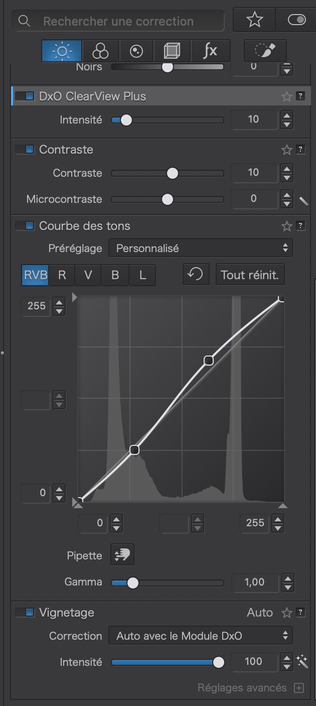 Enfin, les différents outils de retouche sont empilés dans la barre latérale de droite – qui prendra un certain temps à appréhender. L’affichage « DxO Standard », et encore davantage avec l’interface « DxO Advanced ». L’affichage devient particulièrement dense, et on perd du temps à scroller de haut en bas pour retrouver un réglage précis. Heureusement, comme vu plus haut, que la barre « Recherche une correction » est présente.