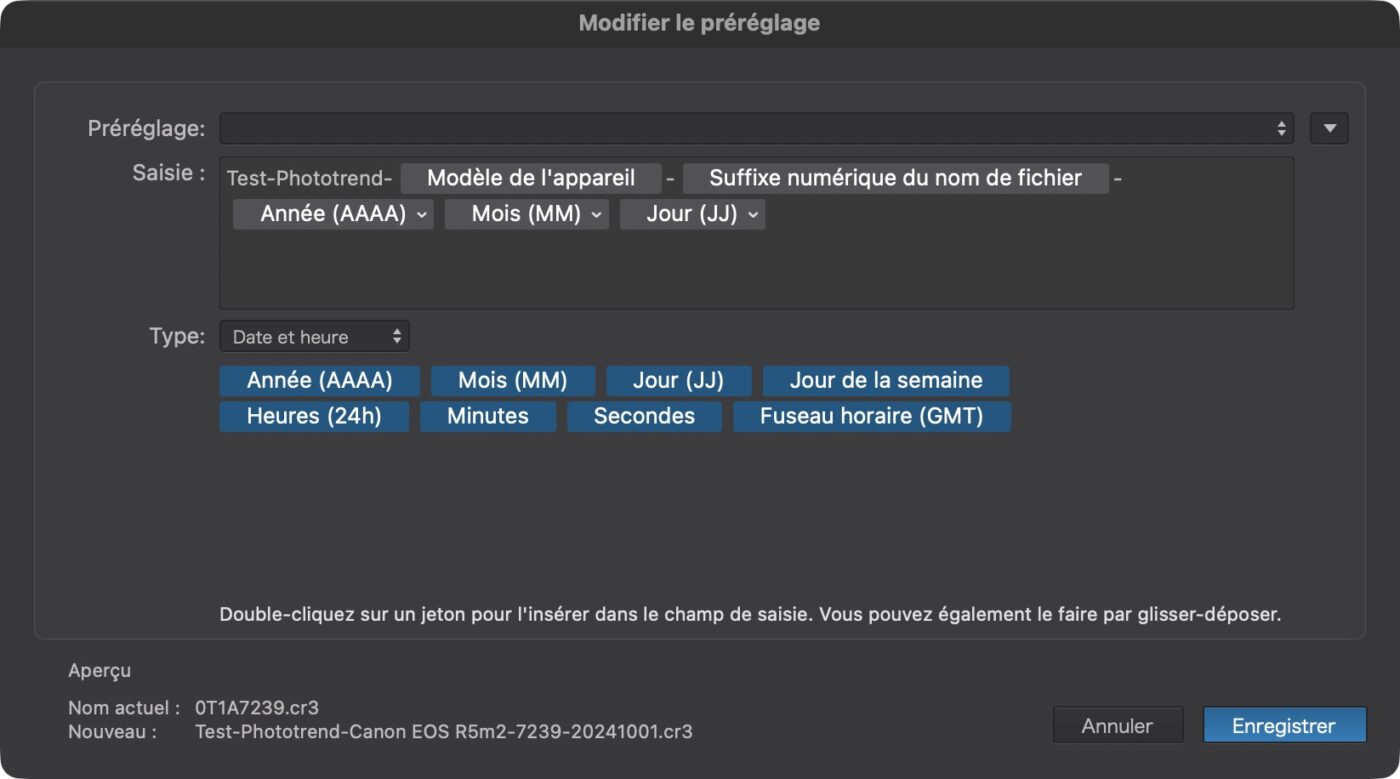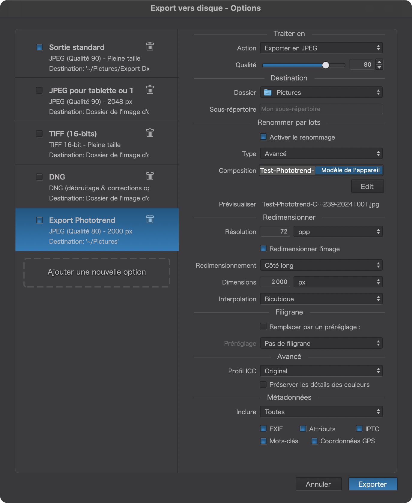 Le module Exporter s’avère complet. À gauche, on dispose de « presets » d’export. Il est d’ailleurs possible d’en sélectionner plusieurs, afin d’exporter une série d’images en plusieurs formats en une fois. Et, cerise sur le gâteau, il est possible de créer une composition personnalisée pour le nom des fichiers, à l’export comme dans la Photothèque, incluant texte personnalisé, données EXIF et IPTC, date et heure, etc.
