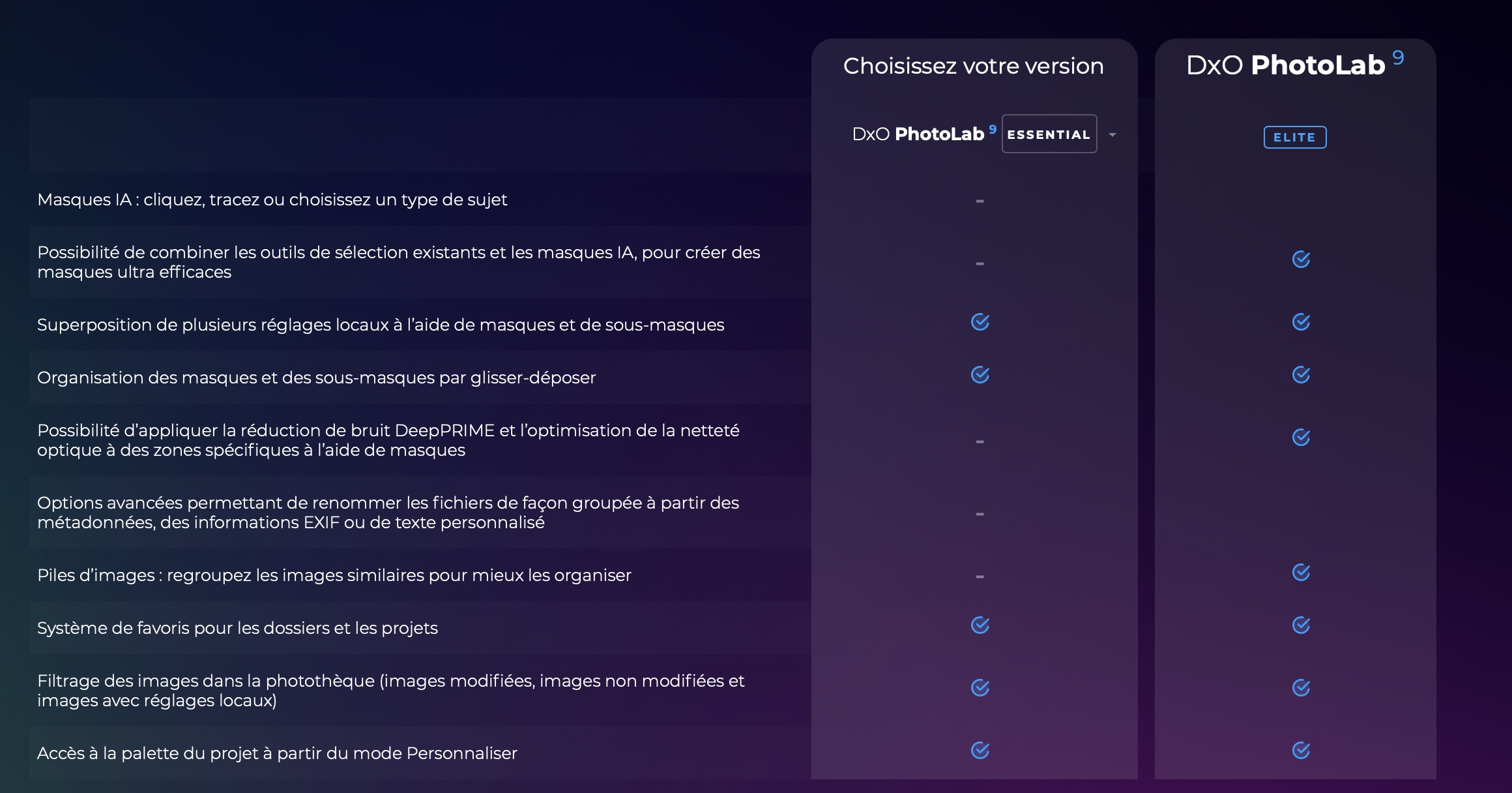 DxO PhotoLab 9 reste fidèle à ses principes et est disponible en achat unique. Le logiciel est proposé en deux versions :