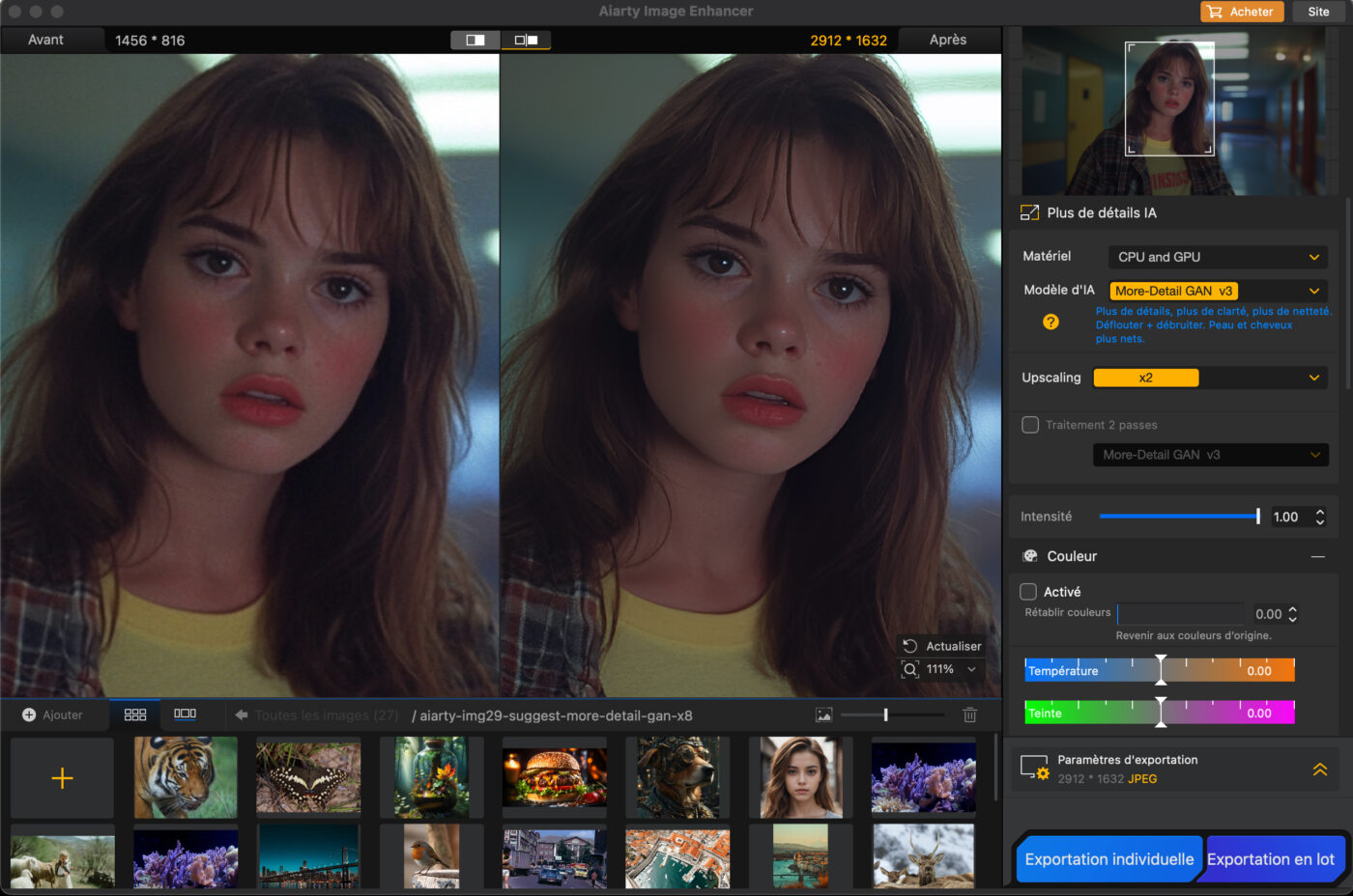 - Amélioration des visages : une fonction dédiée aux portraits et photos basse résolution, conçue pour restaurer les détails du visage (cils, texture de peau) sans l’effet « lissé » artificiel courant sur ce type d’outil.