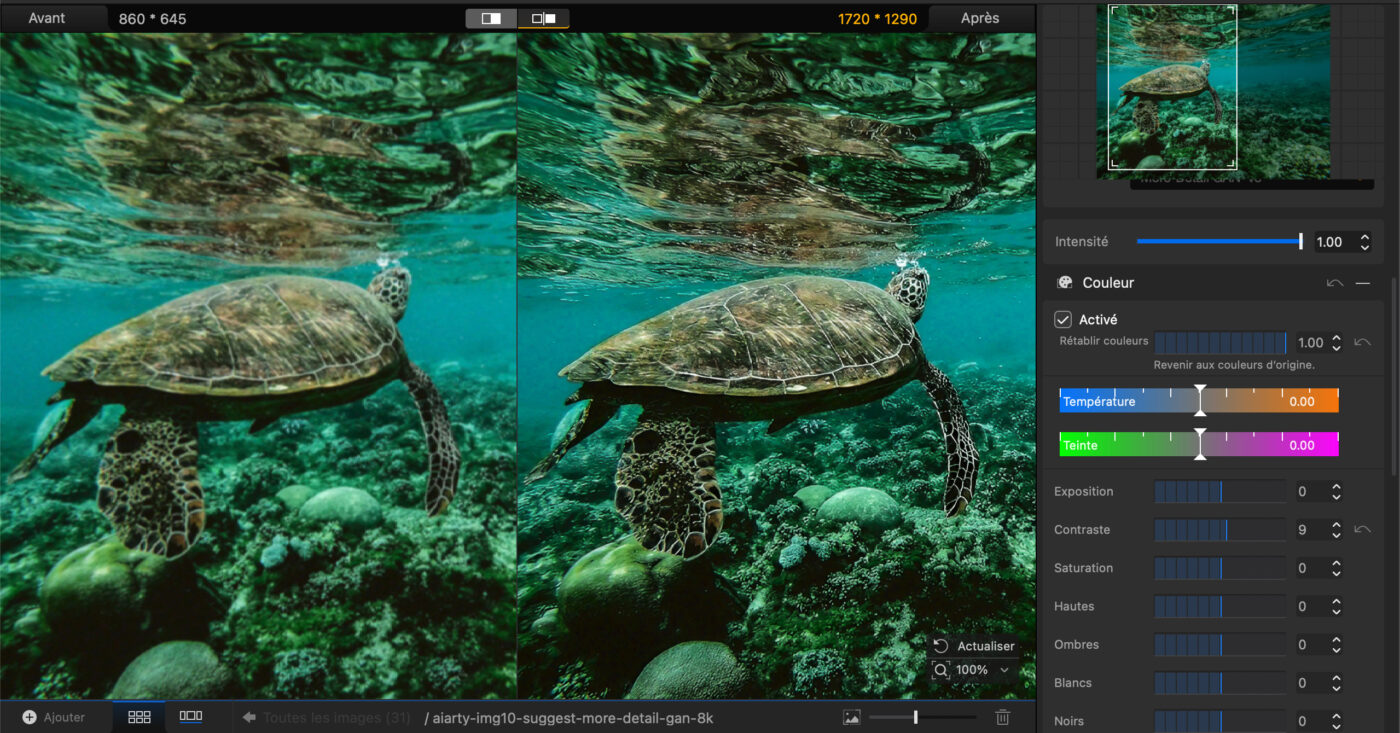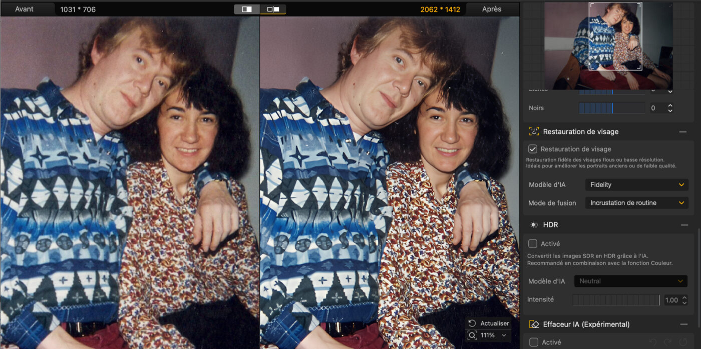 - Restauration des couleurs contrôlée : un réglage permet de doser la correction entre l’image originale et le résultat amélioré, pour éviter les rendus trop surréalistes.