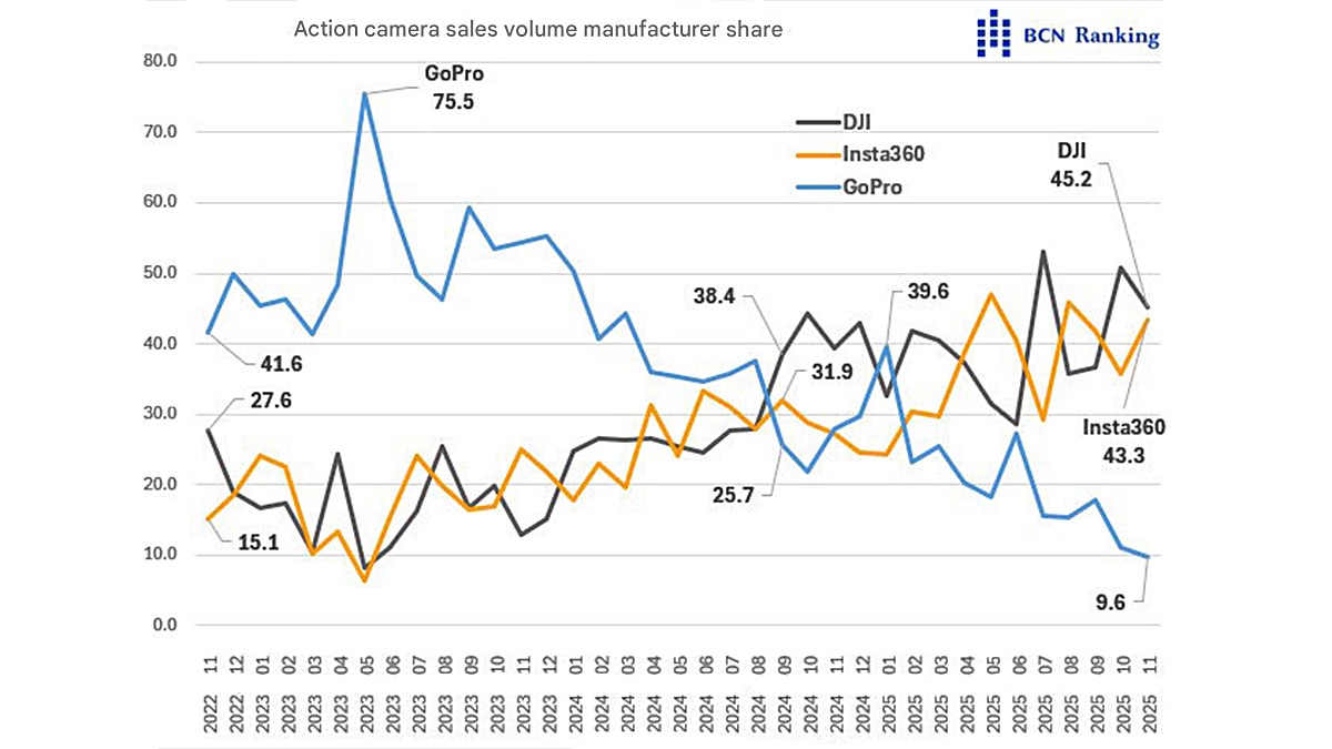Ainsi, en novembre 2025, la firme faisait même son plus mauvais mois depuis des années avec seulement 9,6 % de parts de marché, contre 43 % pour Insta360 et 45 % pour DJI le même mois.