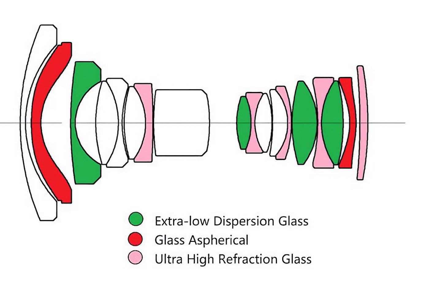- construction optique : 18 éléments répartis en 12 groupes (dont 2 lentilles asphériques, 4 lentilles ED et 5 lentilles UHR)