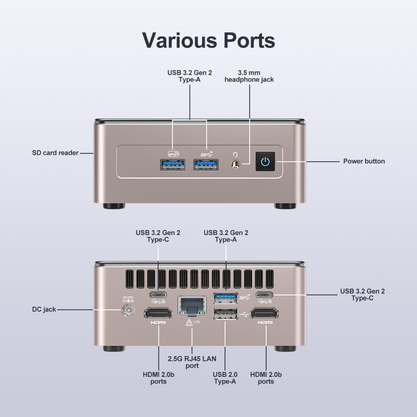 Pour un PC aussi compact (117 x 112 x 49,2 mm) et 652 g, le A5 ne lésine pas sur les ports : trois ports USB 3.2 Gen 2 Type-A, deux USB 3.2 Gen 2 Type-C (avec sortie DisplayPort), un USB 2.0, deux HDMI 2.0, un port Ethernet 2,5 Gbit/s, un lecteur de carte SD, une prise casque 3,5 mm et un verrou Kensington. Le tout permet de piloter jusqu’à quatre écrans 4K simultanément, voire un écran 8K via USB-C.