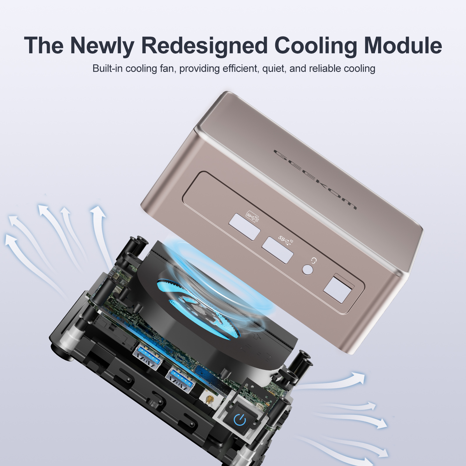 GEEKOM a intégré son système IceBlast 2.0, basé sur un double caloduc en cuivre et une plaque de cuivre dédiée au processeur. Le fabricant annonce une efficacité de refroidissement supérieure de 52 % par rapport aux systèmes standards, avec un niveau sonore qui reste discret, un point souvent critique sur les mini PC.