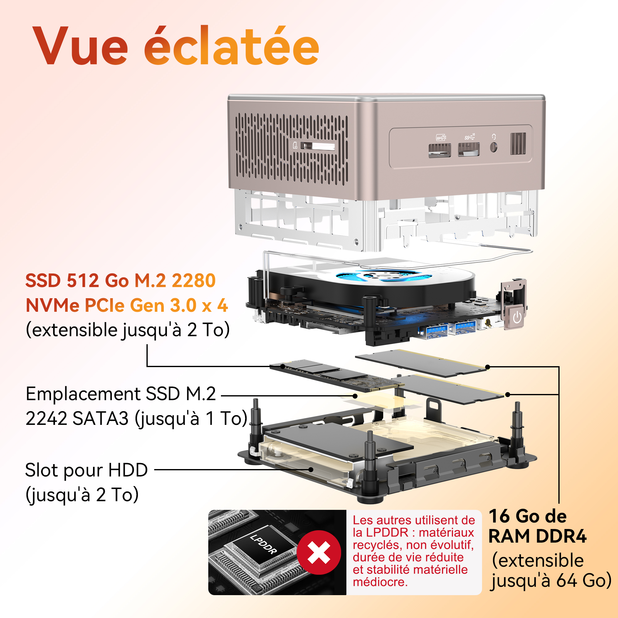 La configuration proposée en promotion embarque 16 Go de RAM DDR4 en SO-DIMM (extensible jusqu’à 64 Go) et un stockage SSD 512 Go. Un emplacement M.2 2242 SATA et un emplacement pour disque 2,5 pouces permettent d’étendre le stockage jusqu’à 5 To au total, un vrai atout pour faire évolution son stockage plus tard.