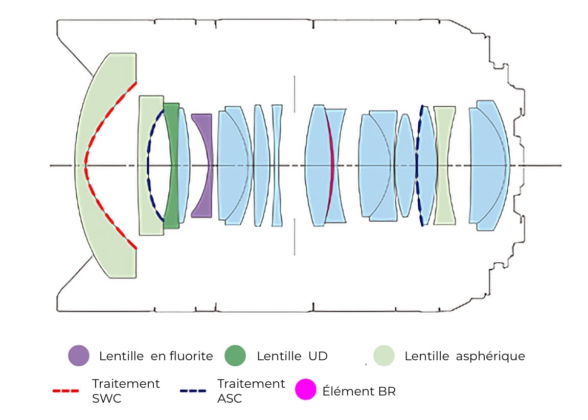 - construction optique : 18 lentilles réparties en 13 groupes