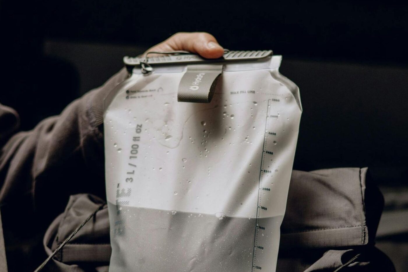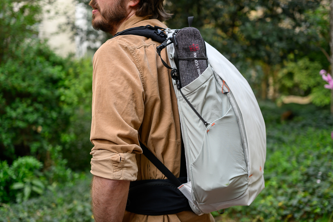 En déroulant le roll-top, on découvre aussi une cavité assez profonde à l’avant, qui peut servir à ranger divers équipements. Peak Design l’illustre surtout comme un espace pour y glisser une poche à eau type CamelBak, pratique pour les longues excursions.