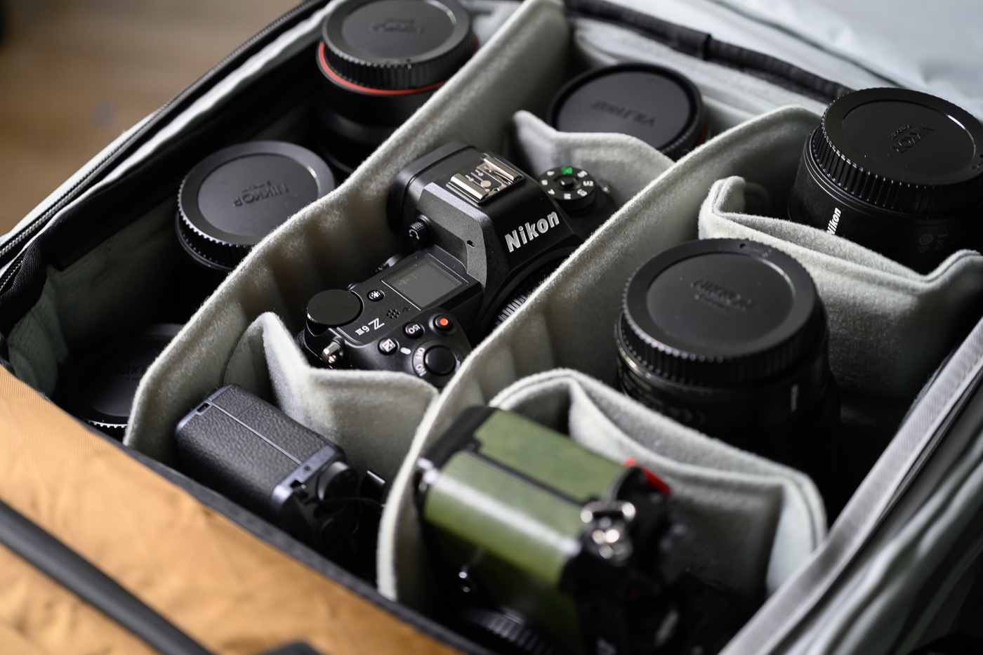 Le modèle 45L peut recevoir des Camera Cubes de toute taille. Avec un cube Medium « classique », on peut ranger un setup complet composé de trois boîtiers (ici Nikon Z6 III, Zf et Ricoh GR III) et cinq à six optiques. Des cubes de tailles inférieures pourront laisser plus de place aux affaires personnelles.