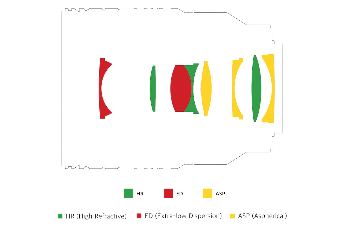 - construction optique : 14 lentilles en 11 groupes, dont 3 lentilles HR (haute réfraction), 2 lentilles ED et 3 lentilles asphériques