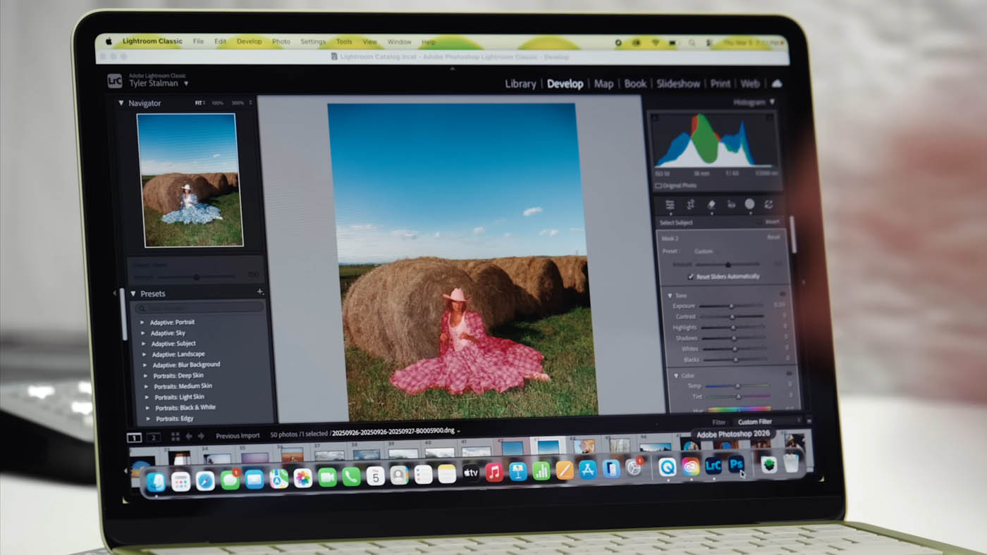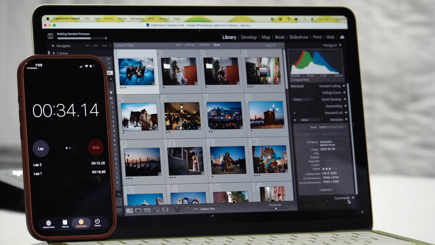 Tyler Stalman teste également un workflow photo exigeant : 50 fichiers RAW de 100 mégapixels (Hasselblad, 200 Mo chacun) importés dans Lightroom Classic en 50 secondes.