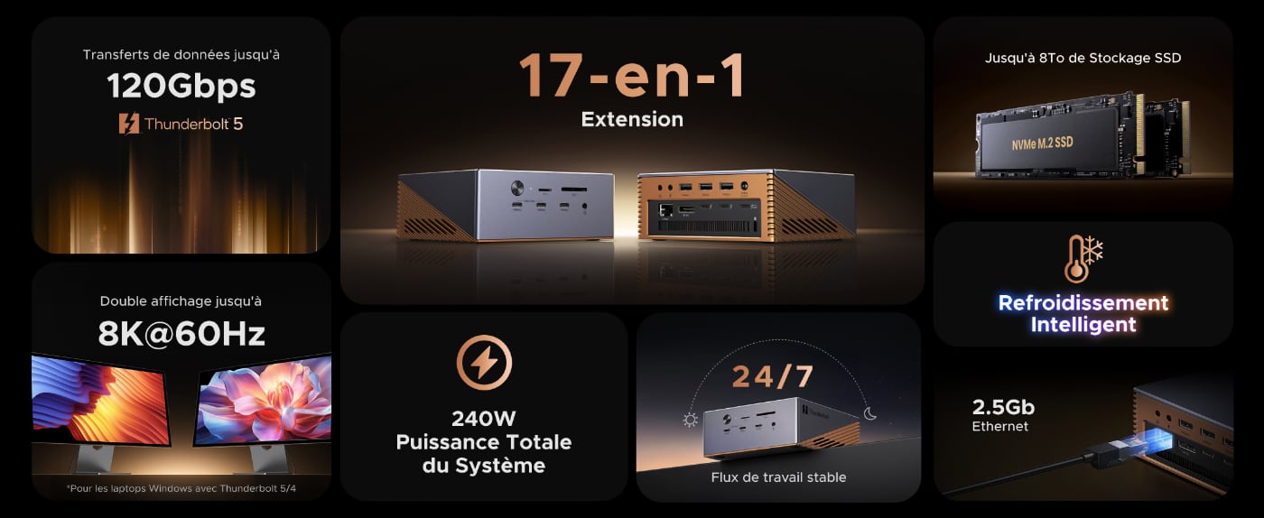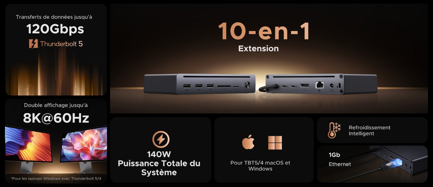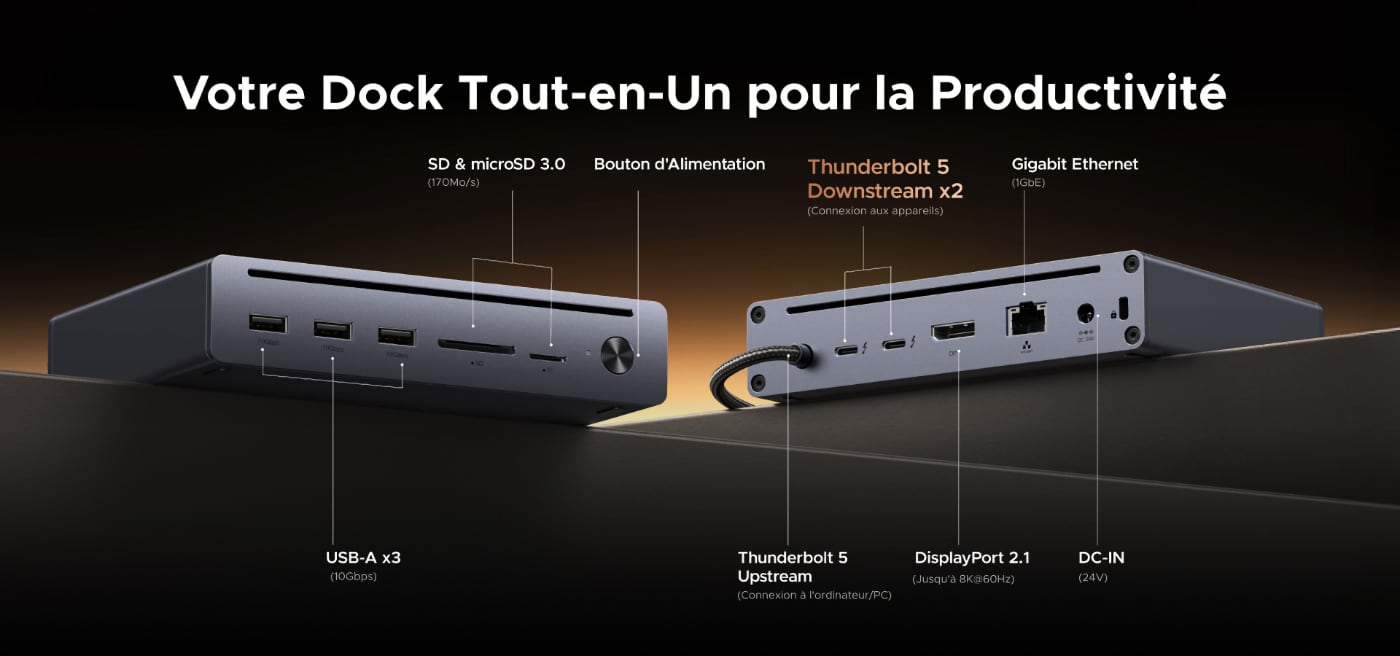 Les trois docks partagent les mêmes capacités d’affichage : jusqu’à deux écran 8K à 60 Hz ou deux écrans 4K jusqu’à 240 Hz sur macOS, et une bande passante maximale de 120 Gb/s via Thunderbolt 5.