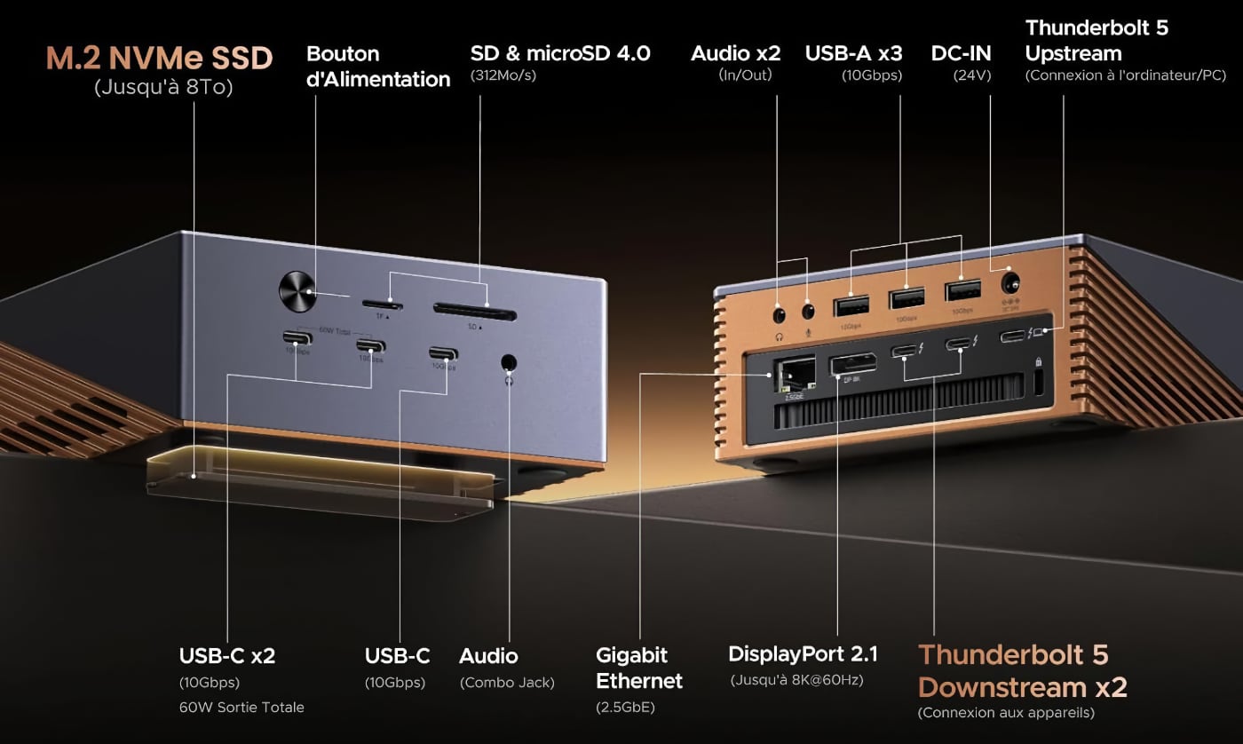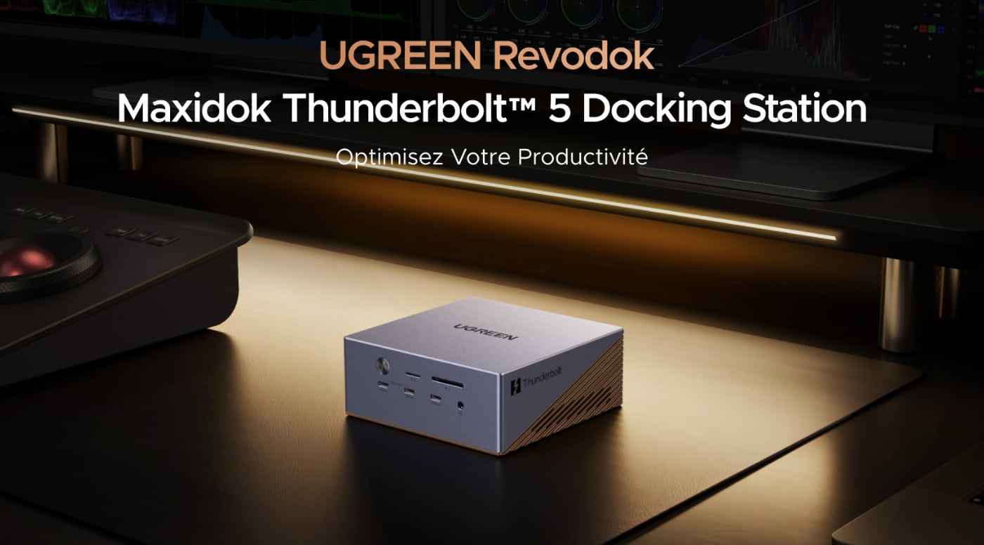 Le marché des docks Thunderbolt 5 s’est considérablement étoffé depuis un an, avec des modèles signés CalDigit, OWC, Anker ou encore Ivanky. Ugreen, qui proposait déjà des docks Thunderbolt 4, lance trois nouvelles stations d’accueil certifiées Thunderbolt 5. Leur particularité : deux des trois modèles intègrent un emplacement NVMe M.2 PCIe Gen4, capable d’accueillir un SSD jusqu’à 8 To, une fonctionnalité encore rare à ce niveau de prix.