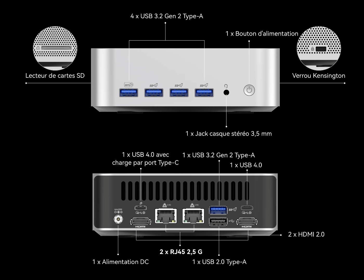 La configuration embarque 16 Go de DDR5 et un SSD 1 To. La mémoire et le stockage ne sont pas soudés : la RAM est extensible jusqu’à 64 Go, et le stockage jusqu’à 2 To via deux slots NVMe.