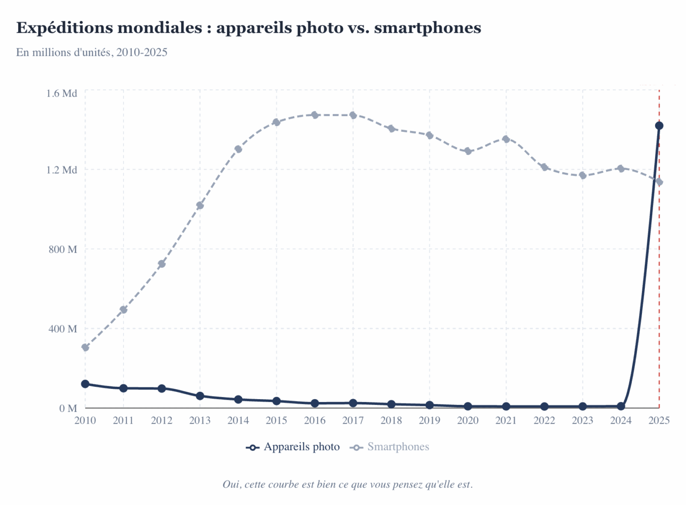 Les derniers chiffres publiés par la CIPA (Camera & Imaging Products Association) marquent un tournant historique pour l’industrie photographique. Avec 1,42 milliard d’appareils photo expédiés en 2025, le marché de la photo numérique dépasse pour la première fois celui des smartphones, en recul à 1,38 milliard d’unités selon les données IDC.