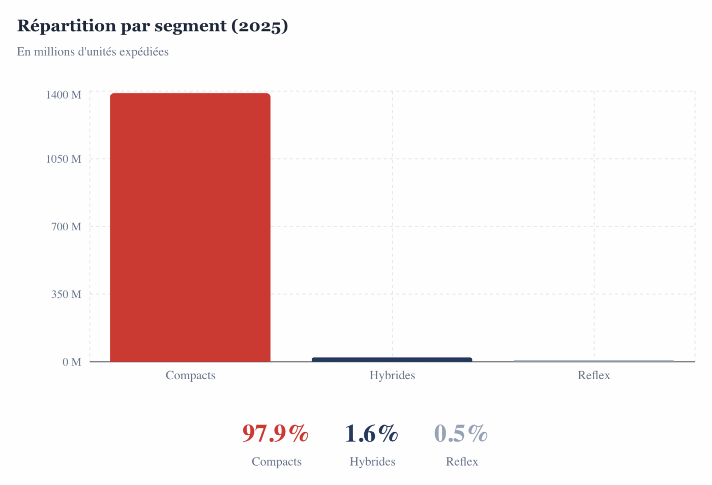 Les données annuelles de la CIPA, publiées fin février, confirment la tendance observée mois après mois. Les expéditions totales d’appareils photo numériques atteignent 1,42 milliard d’unités en 2025, soit une hausse de 14 950 % par rapport aux 9,44 millions d’unités de 2024.