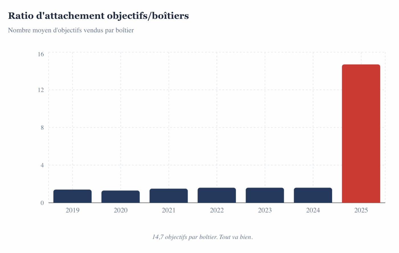 Côté objectifs, le ratio d’attachement a lui aussi bondi de façon remarquable : chaque boîtier vendu s’accompagne désormais en moyenne de 14,7 objectifs, contre 1,6 en 2024. « Les consommateurs n’achètent plus un appareil photo, ils achètent un écosystème », commente un analyste dans une note publiée ce matin.