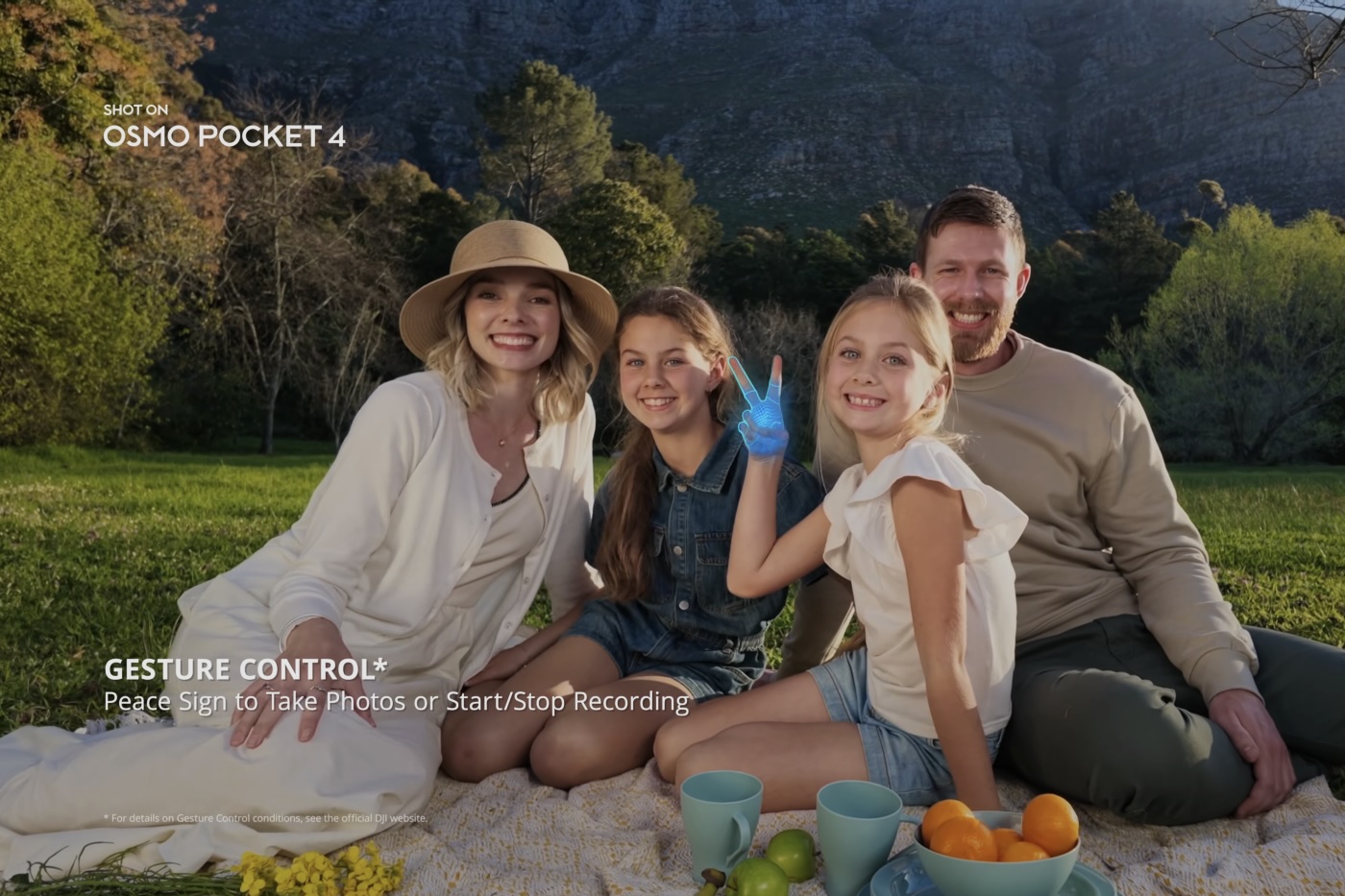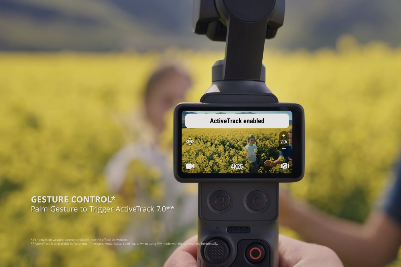 Comme sur les drones de la marque, le contrôle gestuel fait son apparition : paume ouverte pour activer/désactiver l’ActiveTrack, signe « V » pour déclencher une photo ou démarrer/arrêter l’enregistrement vidéo. C’est pratique pour les plans fixes en solo, sans avoir à toucher la caméra.