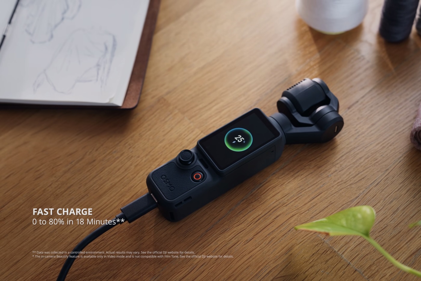 L’autonomie de l’Osmo Pocket 4 s’améliore grâce à une nouvelle batterie de 1300 mAh. Elle grimpe à 240 minutes en 1080p 24 fps (contre 166 minutes sur l’OP3 dans les mêmes conditions), soit une progression d’environ 45%.