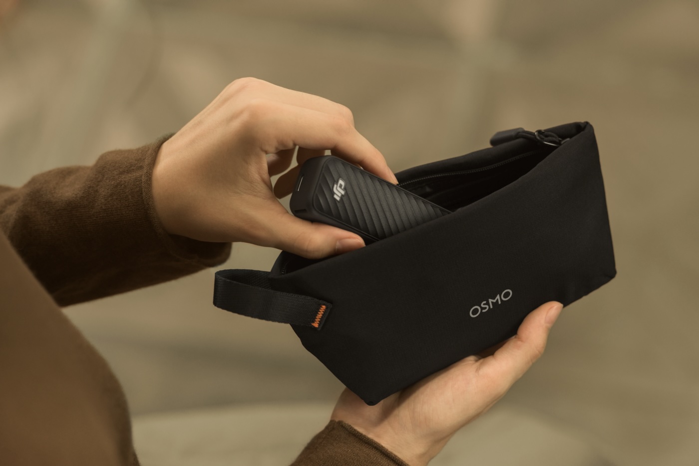 L’Osmo Pocket 4 reste fidèle au format compact de la gamme : 14,4 x 4,4 x 3,5 cm pour 190,5 g (contre 13,9 x 4,2 x 3,3 cm et 179 g pour l’Osmo Pocket 3). La caméra reste parfaitement « pocketable » comme on dit, avec désormais un système de verrouillage de la nacelle (une pince de nacelle selon DJI) et une petite sacoche de transport, à la place de la coque de protection rigide fournie auparavant.