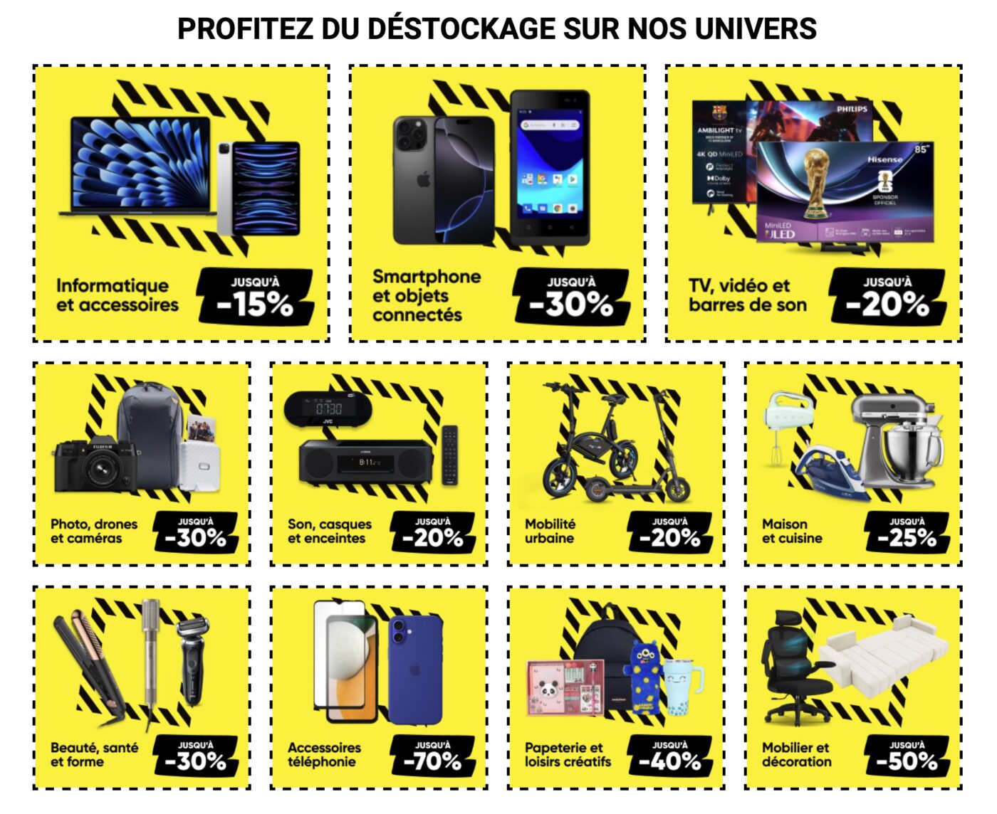 L’opération couvre de nombreux univers : photo, drones et caméras (jusqu’à -30 %), informatique et accessoires (jusqu’à -15 %), smartphones (jusqu’à -30 %), TV et vidéo (jusqu’à -20 %), son (jusqu’à -20 %), et bien d’autres catégories.