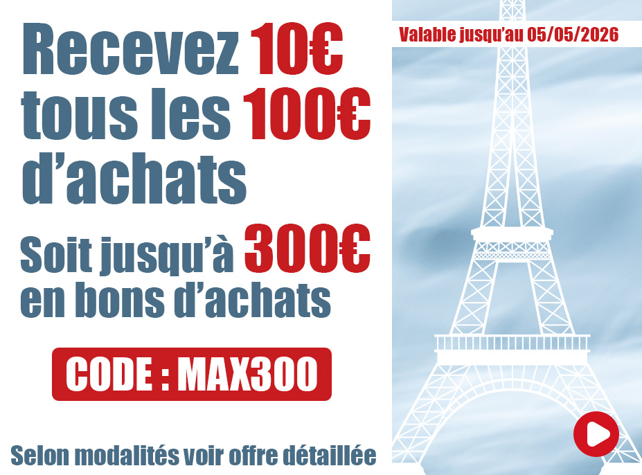 Pour profiter de cette opération, il suffit de saisir le code MAX300 dans le champ « code de réduction » au moment de la validation du panier. Attention, l’offre n’est valable que sur les produits signalés comme éligibles sur leur fiche produit, et le code ne peut être utilisé qu’une seule fois par compte client.