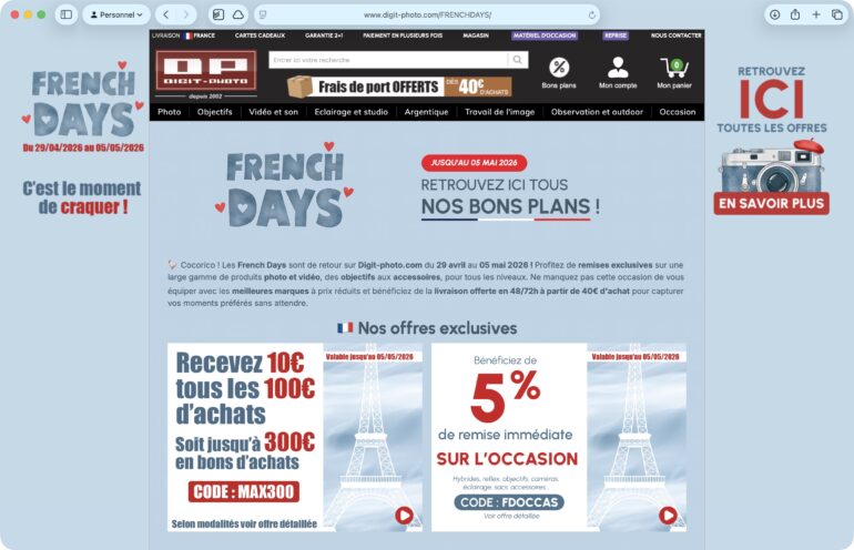 À l’occasion des French Days de printemps, Digit-Photo propose 10 € offerts en bon d’achat par tranche de 100 € dépensés, avec jusqu’à 300 € d’économies. L’offre est active du mercredi 29 avril au mardi 5 mai 2026 inclus sur Digit-Photo.com ainsi qu’au magasin de Metz, à activer avec le code promo MAX300.