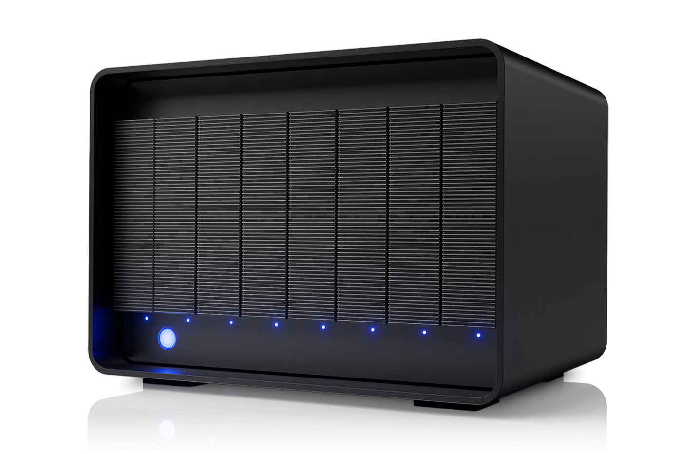 Le dernier 8big en date remontait à 2014 en format rack. Le 8big Pro5 renoue avec le format “desktop”, avec un boîtier en aluminium noir assez imposant au design minimaliste. Il intègre 8 emplacements pour des disques durs 3,5 pouces et dispose d’une poignée intégrée pour faciliter le transport entre bureau et studio.