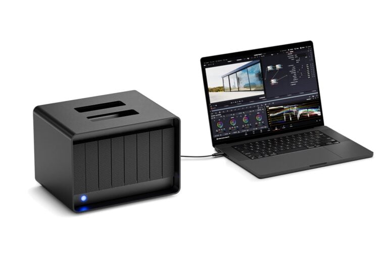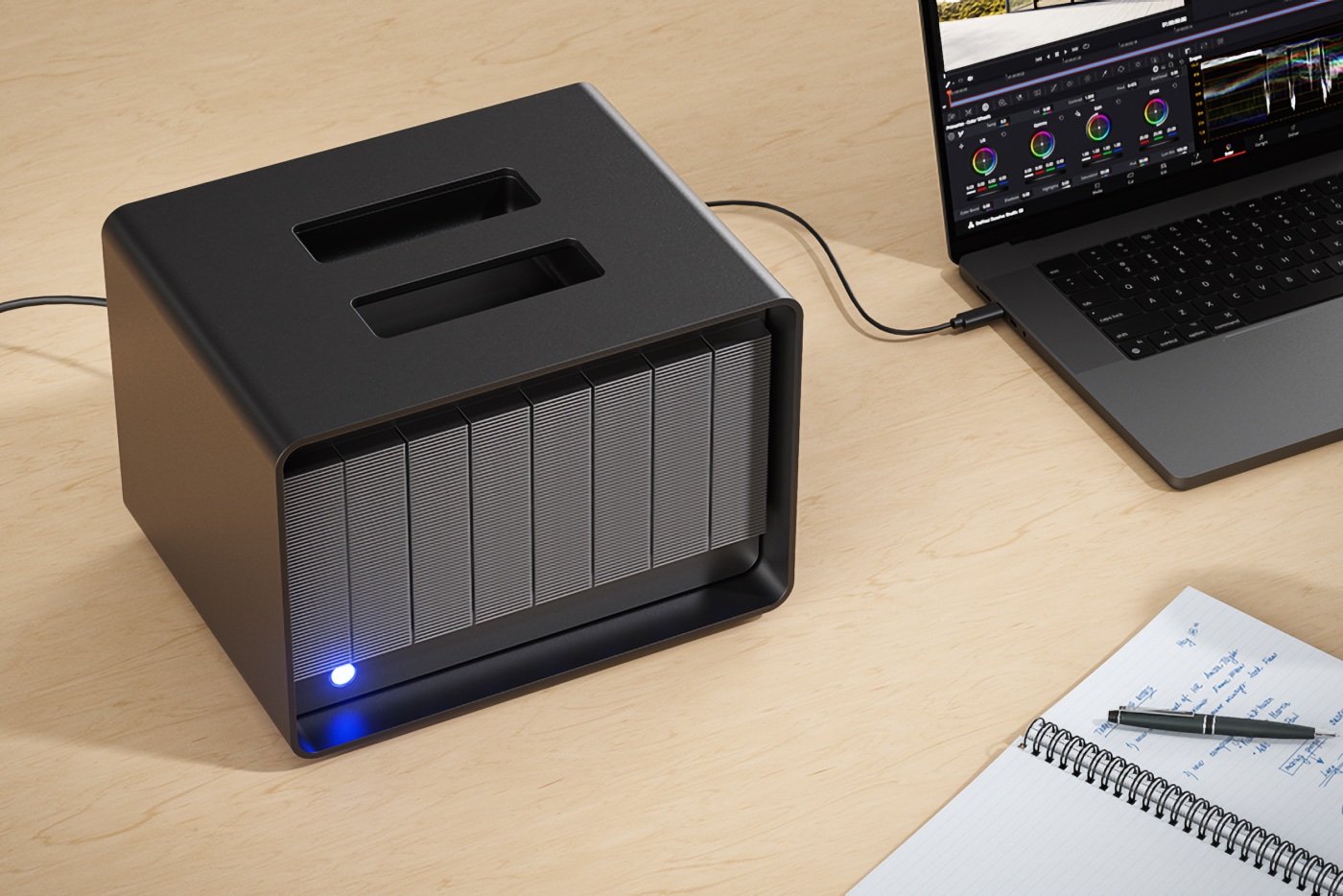 Sur le papier, le 8big Pro5 coche toutes les cases d’un stockage pro moderne : Thunderbolt 5, jusqu’à 256 To, RAID matériel, disques entreprise, design signé Neil Poulton, et une alimentation hôte de 140 W qui permet de simplifier franchement le câblage d’une station de montage.
