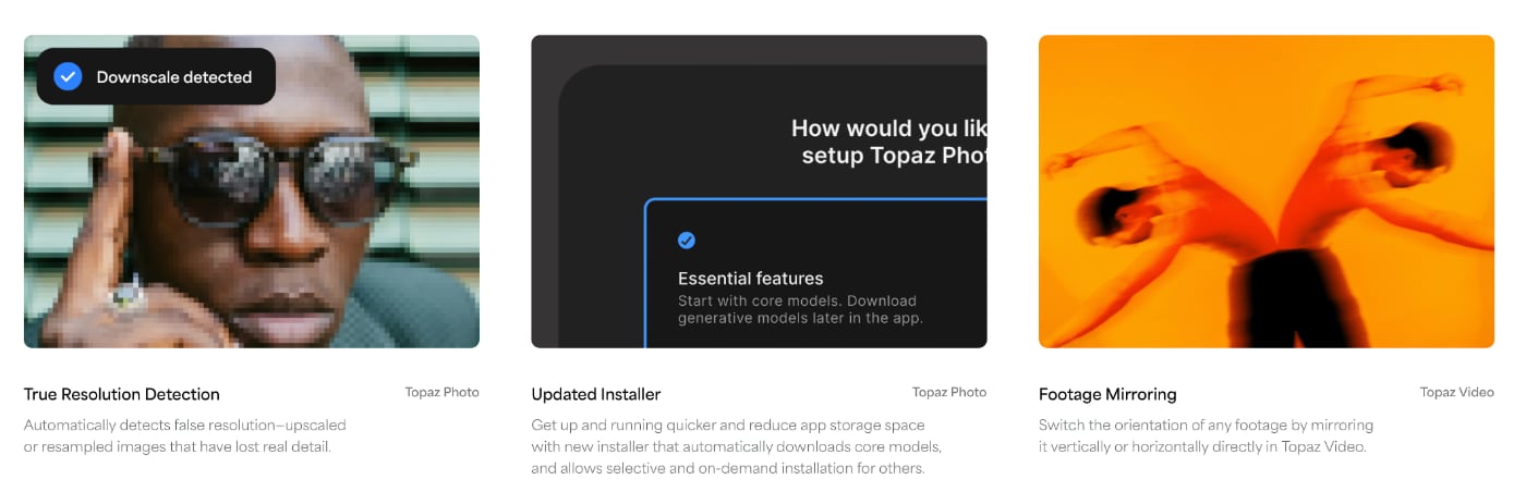S’ajoutent à cela plusieurs améliorations fonctionnelles, parmi lesquelles une détection automatique des « fausses résolutions » dans Topaz Photo (les images upscalées ayant perdu leur détail réel), un nouvel installeur plus léger et une option de mirroring de séquences dans Topaz Video.