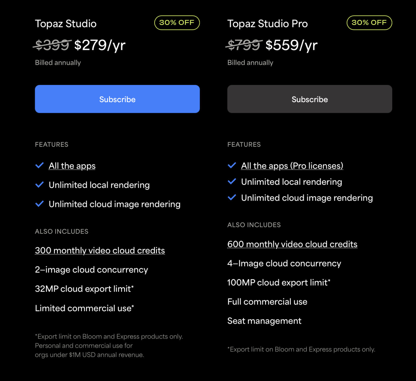 - Topaz Studio Pro à 559 $/an au lieu de 799 $.