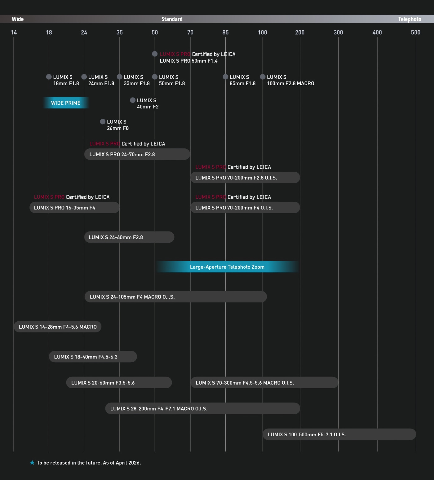 Panasonic a profité de l’annonce de son nouveau Lumix S 40 mm f/2 pour dévoiler une mise à jour de sa feuille de route optique en monture L. Datée d’avril 2026, cette roadmap confirme l’ensemble du catalogue actuel et y ajoute deux mystérieuses optiques en développement, symbolisées par des pastilles turquoises : une focale fixe grand-angle et un télézoom à grande ouverture.