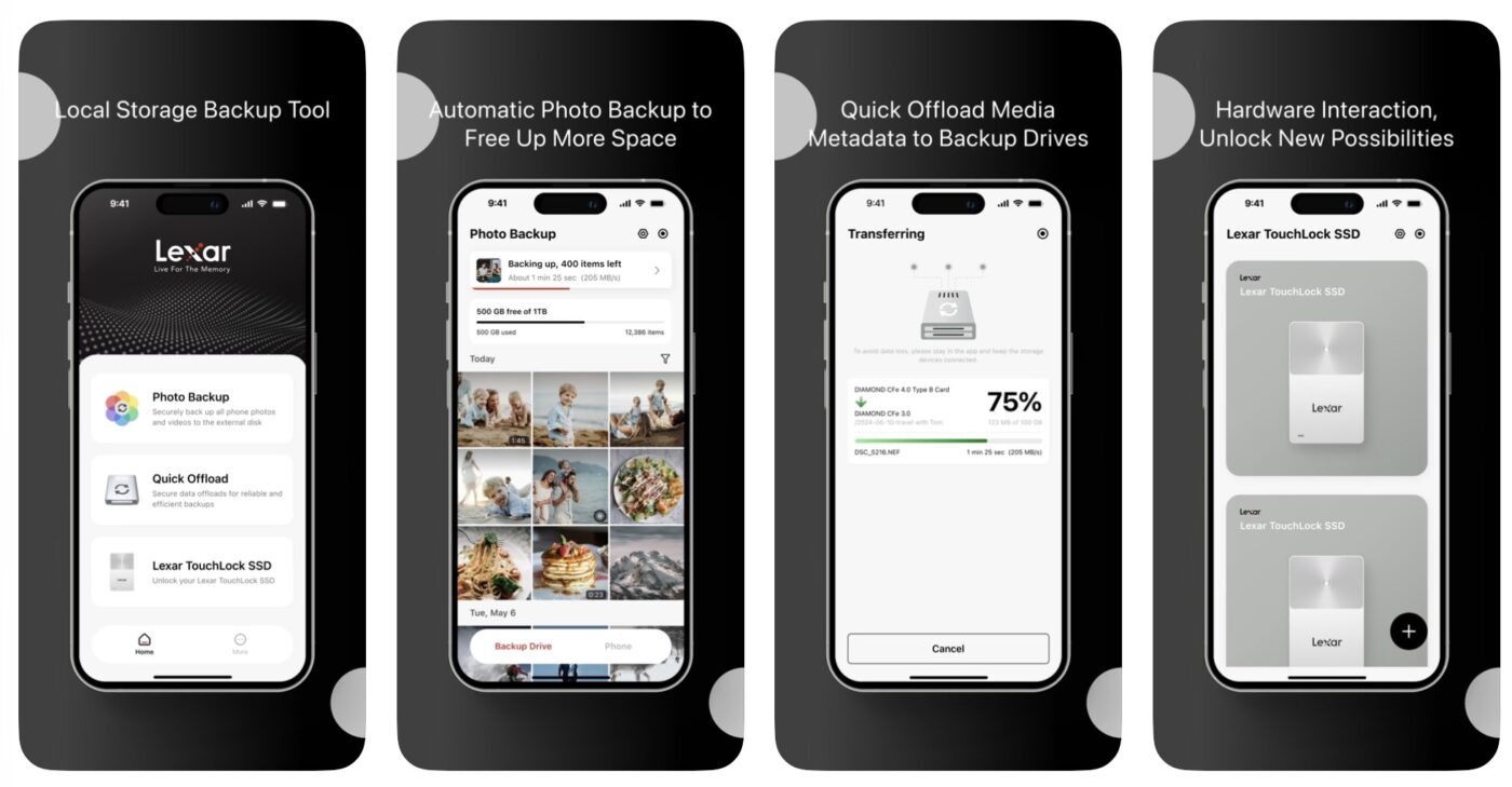 Sur mobile, le smartphone est également compatible avec l’application Lexar, disponible sous iOS et Android. Elle permet notamment de lancer la sauvegarde automatique de ses photos ou de transférer rapidement ses rushs photo ou vidéo, pratique si vous n’avez pas souscrit à une offre de stockage cloud pour vos images.