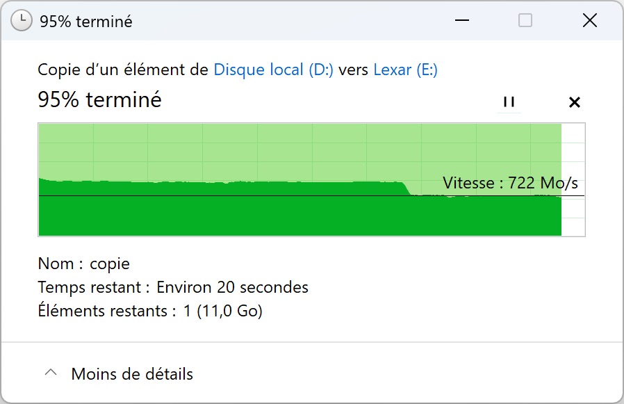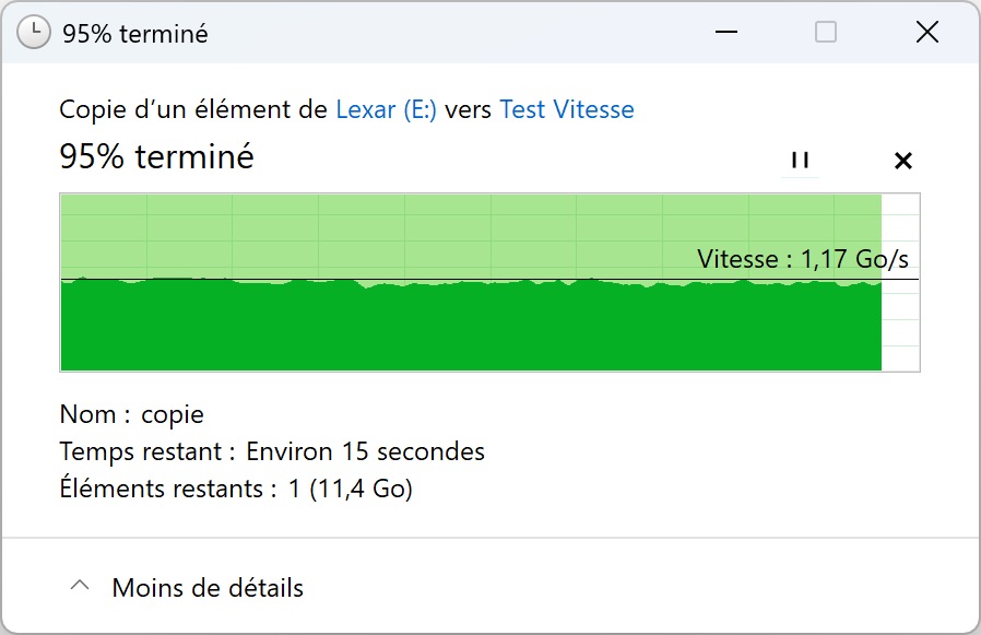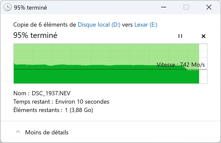 Un comportement loin d’être isolé sur ce type de support miniature, mais qui ne s’avère pas réellement pénalisant à l’usage, étant donné que, même diminué, le SSD demeure assez rapide et bien plus efficace qu’un LaCie Rugged Mini SSD (aussi 3.2 Gen 2×2). De plus, lors de la copie vers le PC, le Lexar s’est montré très performant avec une vitesse moyenne approchant les 1,2 Go/s.