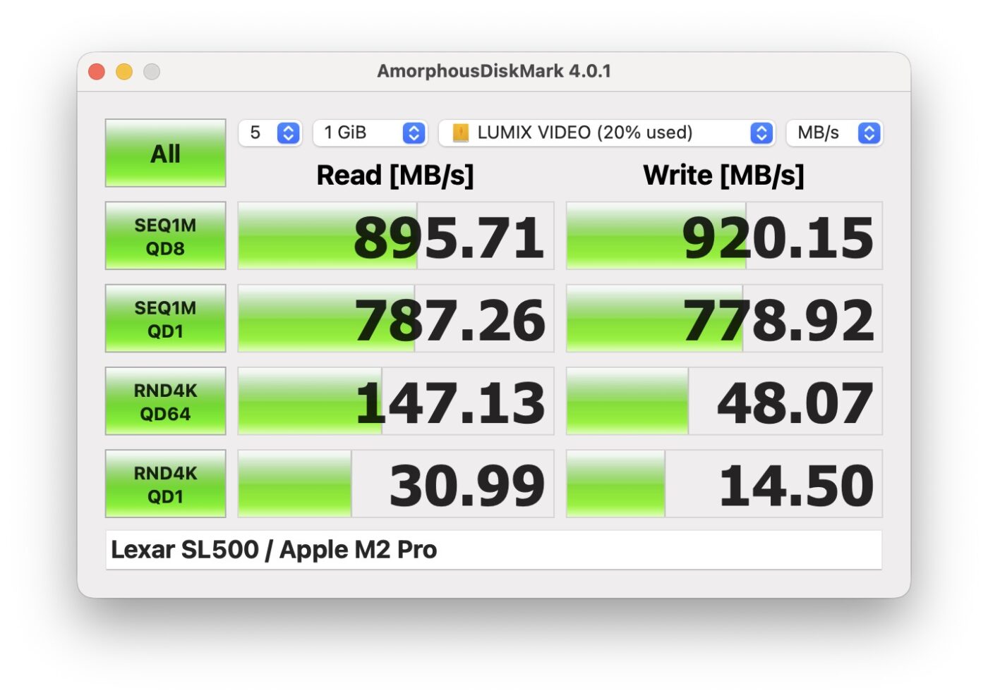 La norme USB 3.2 Gen 2×2 du SL500M ne donne sa pleine mesure qu’avec des machines équipées de bus compatibles, encore rares sur le marché et déjà supplantées par l’USB 4 et le Thunderbolt 4/5. Sur le MacBook Pro, le Lexar plafonne ainsi à 895 Mo/s en lecture et 920 Mo/s en écriture, soit moins de la moitié des vitesses annoncées.
