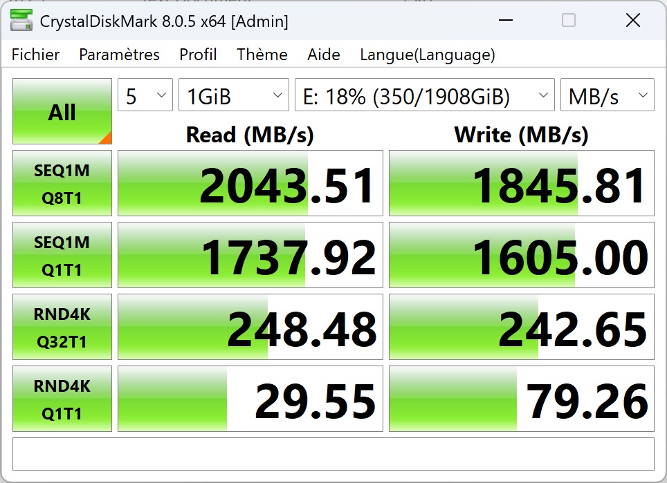 - débits théoriques : jusqu’à 2 000 Mo/s en lecture et 1 800 Mo/s en écriture