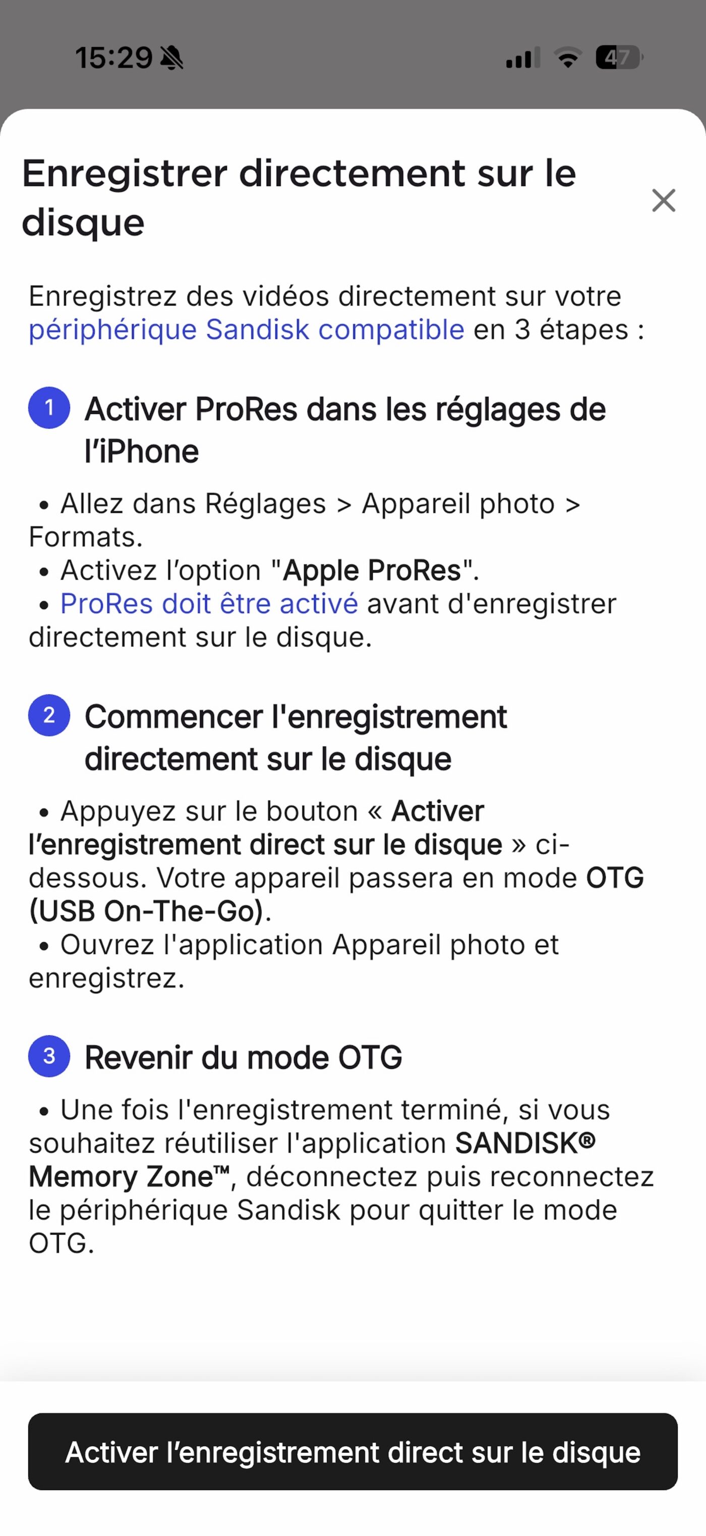 Mais en pratique, nous n’avons pas pu atteindre cette limite : l’enregistrement s’est interrompu au bout de 11 minutes seulement. Par la suite, malgré plusieurs tentatives, l’iPhone refusait de reprendre l’enregistrement avec le SanDisk. À titre de comparaison, un Lexar SL500M, disque comparable en prix et en fonctionnalités, n’a posé aucun problème dans les mêmes conditions.
