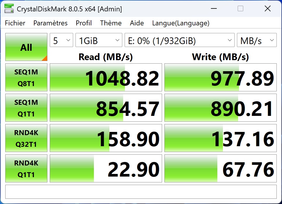 - débits théoriques : jusqu’à 1 000 Mo/s en lecture et 950 Mo/s en écriture