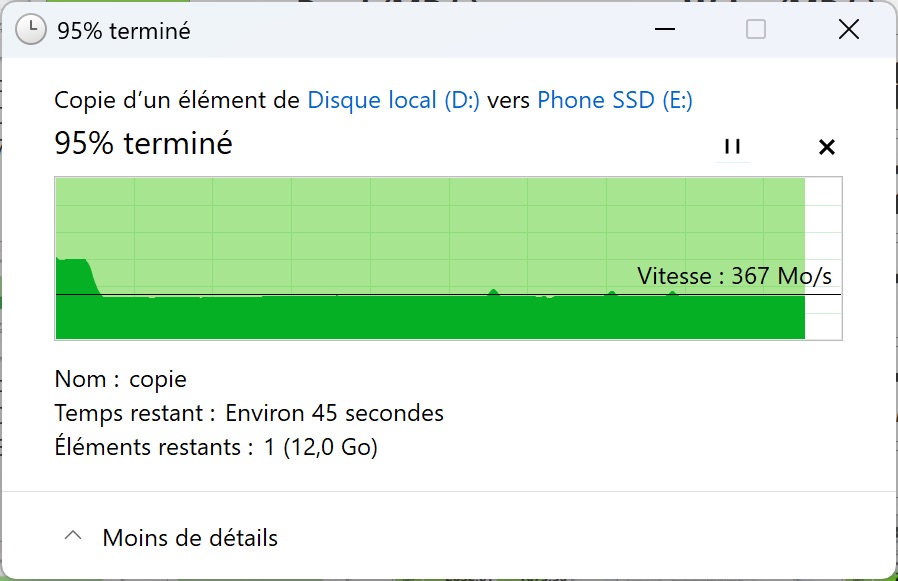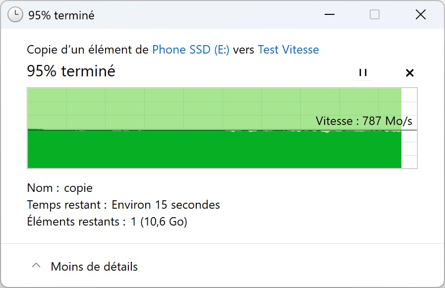 C’est en dessous des performances d’autres SSD USB 3.2 Gen 2 du marché. À titre de comparaison, le LaCie Rugged Mini SSD atteignait au minimum 450 Mo/s dans un contexte similaire, et un autre SanDisk, le Desk Drive, dépassait les 600 Mo/s. Le Creator Phone SSD n’est clairement pas une bête de course.