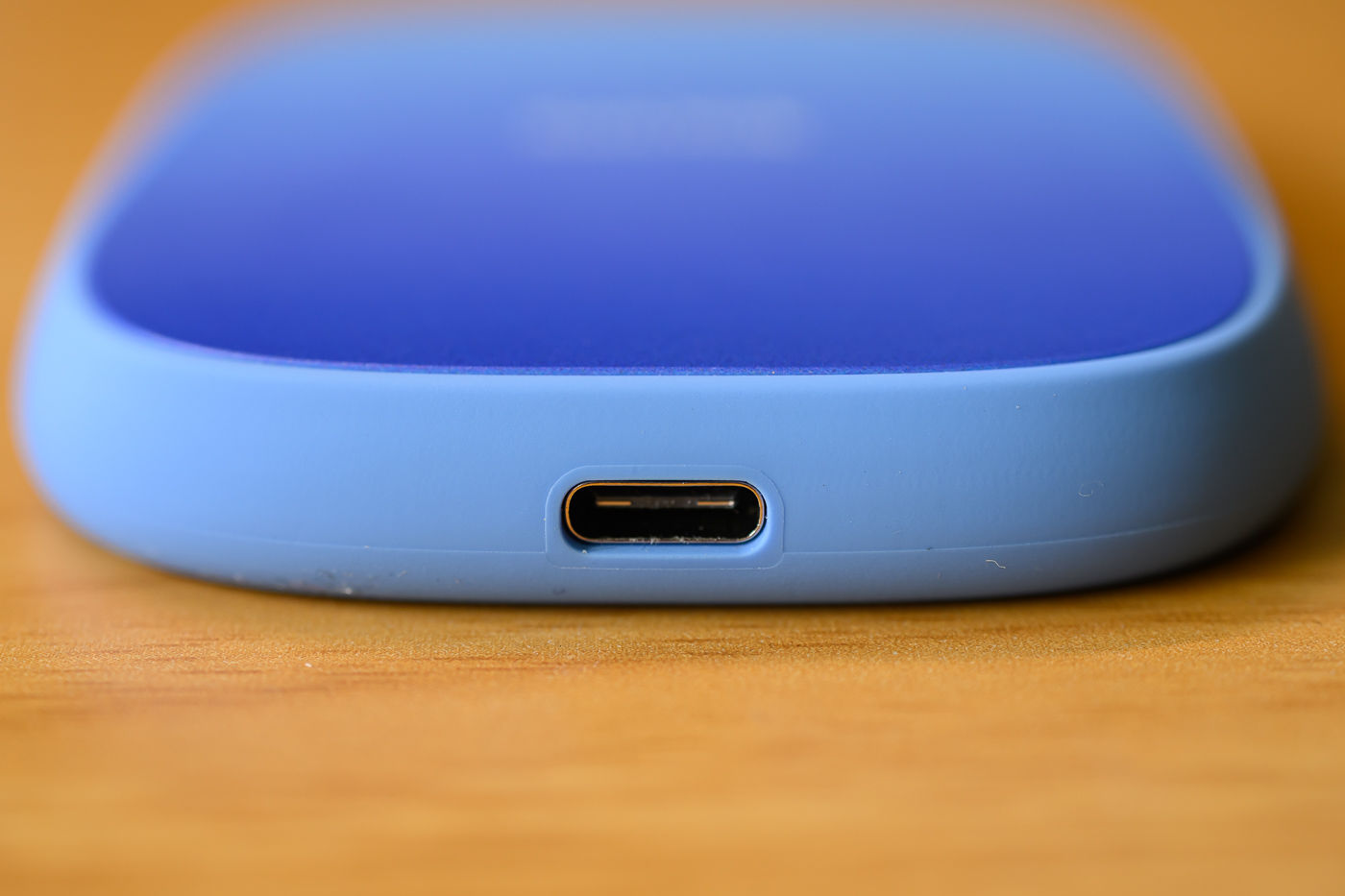 Sa coque en silicone bleu ciel, couleur signature de la gamme Creator, assure une bonne prise en main antidérapante et ne risque pas de rayer un autre appareil. SanDisk revendique une résistance aux chutes jusqu’à 3 mètres, et la certification IP65 protège contre la poussière et les projections d’eau. On note aussi la présence d’un point de fixation pour dragonne, en plus du port USB-C.
