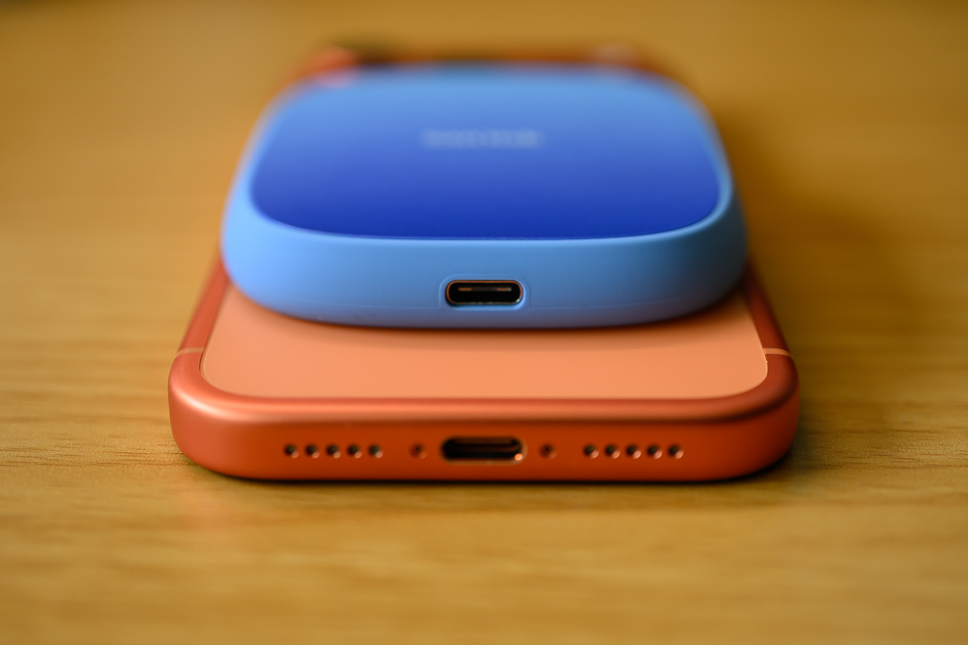 Le SanDisk Creator Phone SSD est fourni avec un câble USB-C vers USB-C rigide d’environ 20 cm (intentionnellement court pour une utilisation accolée au smartphone) et un anneau magnétique à coller au dos d’un téléphone non compatible MagSafe.