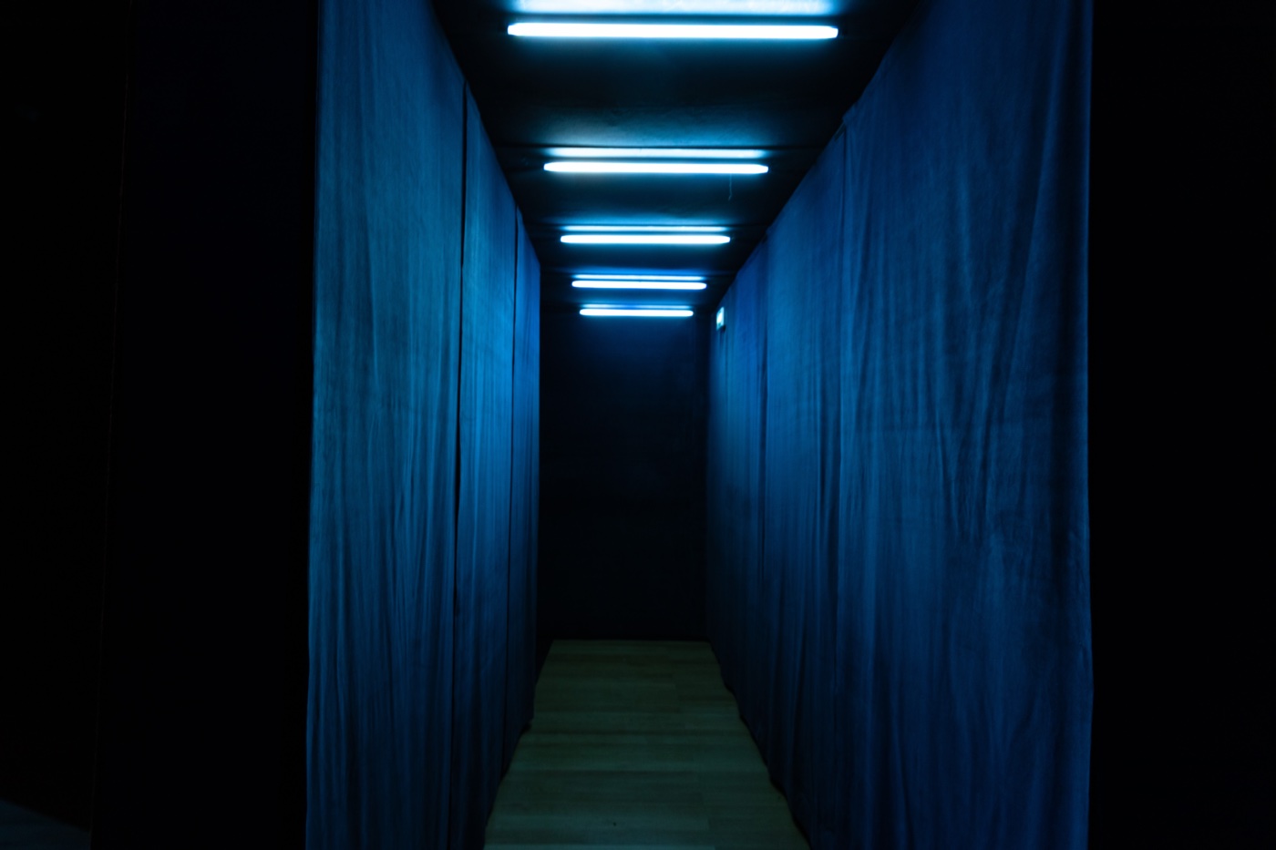 Nous sommes entrés à tâtons. Le Salon d’honneur du Grand Palais a été plongé dans un noir quasi total. Sur le parquet ciré, des reflets rouges, bleus, verts nous accueillent. Il faut quelques secondes pour que l’œil s’ajuste et distingue les masses sombres qui occupent l’espace : cinq pavillons de tissu noir, imposants et silencieux, plantés là tels des monolithes.