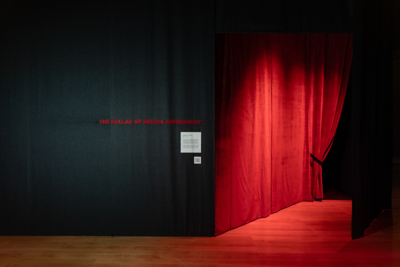 Au centre du dispositif trône The Ballad of Sexual Dependency (1981–2022), l’œuvre matricielle de Nan Goldin. On y pénètre en écartant un lourd rideau cramoisi, comme on entrerait dans un cabaret ou dans un confessionnal. Sept cents diapositives environ s’y succèdent en quarante-deux minutes, portées par un patchwork sonore qui va des Velvet Underground à Edmundo Rivero en passant par James Brown.