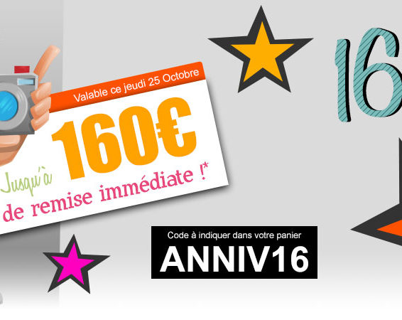 Pour fêter ses 16 ans, Digit-Photo propose aujourd’hui seulement une offre spéciale : 16 € (pour leurs 16 ans) de remise immédiate tous les 200 € d'achats avec le code ANNIV16. Cette offre est limitée à 160€ de remise pour 2000 d’achats et à une remise par compte client.